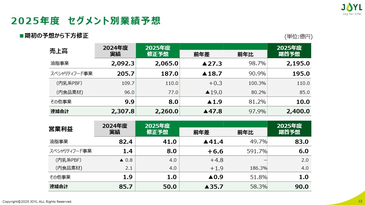 2025年度通期の連結業績予想について、本年5月に公表した通期予想を修正します。油脂事業では、当初想定を上回るコスト上昇に加え、販売価格改定の実現に時間がかかっている状況を受け、業績を修正すべきと判断しました。