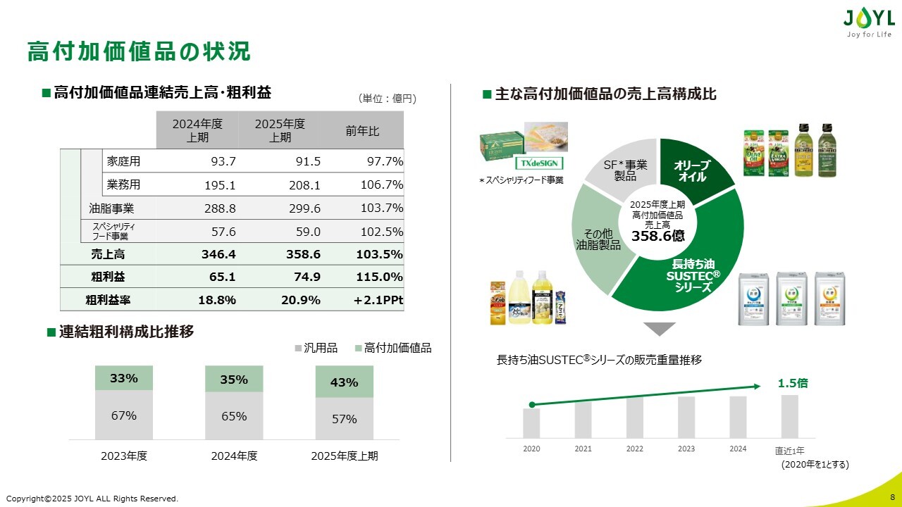 高付加価値品の状況についてご報告します。売上高は、両セグメントともに販売重量の増加や販売価格の改定に伴い、前年から伸長しています。粗利益については、オリーブオイルの原料コストの軟化を背景に収益性が改善し、粗利益の向上に寄与しました。