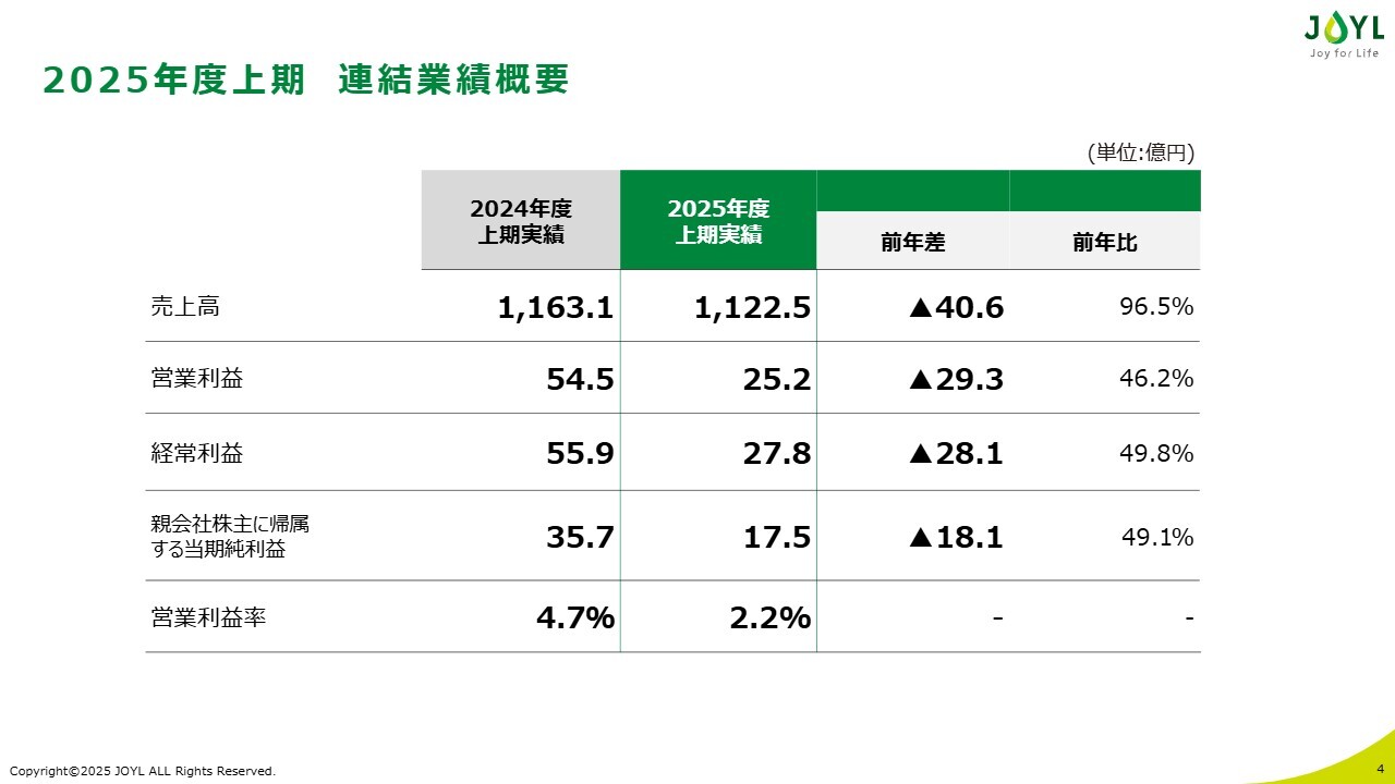 2025年度第2四半期の連結業績は、売上高1,122億5,000万円、営業利益25億2,000万円、経常利益27億8,000万円、当期純利益17億5,000万円となり、前年同期比で減収減益となりました。