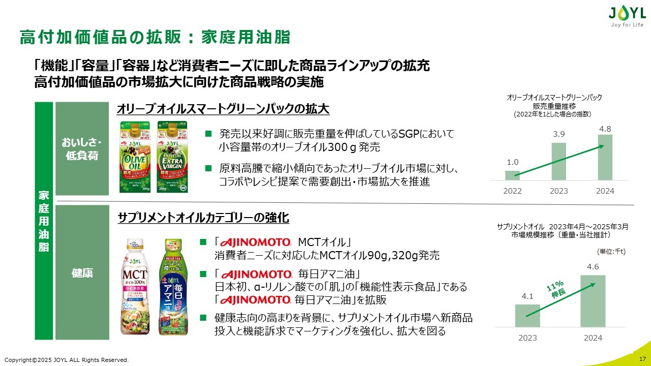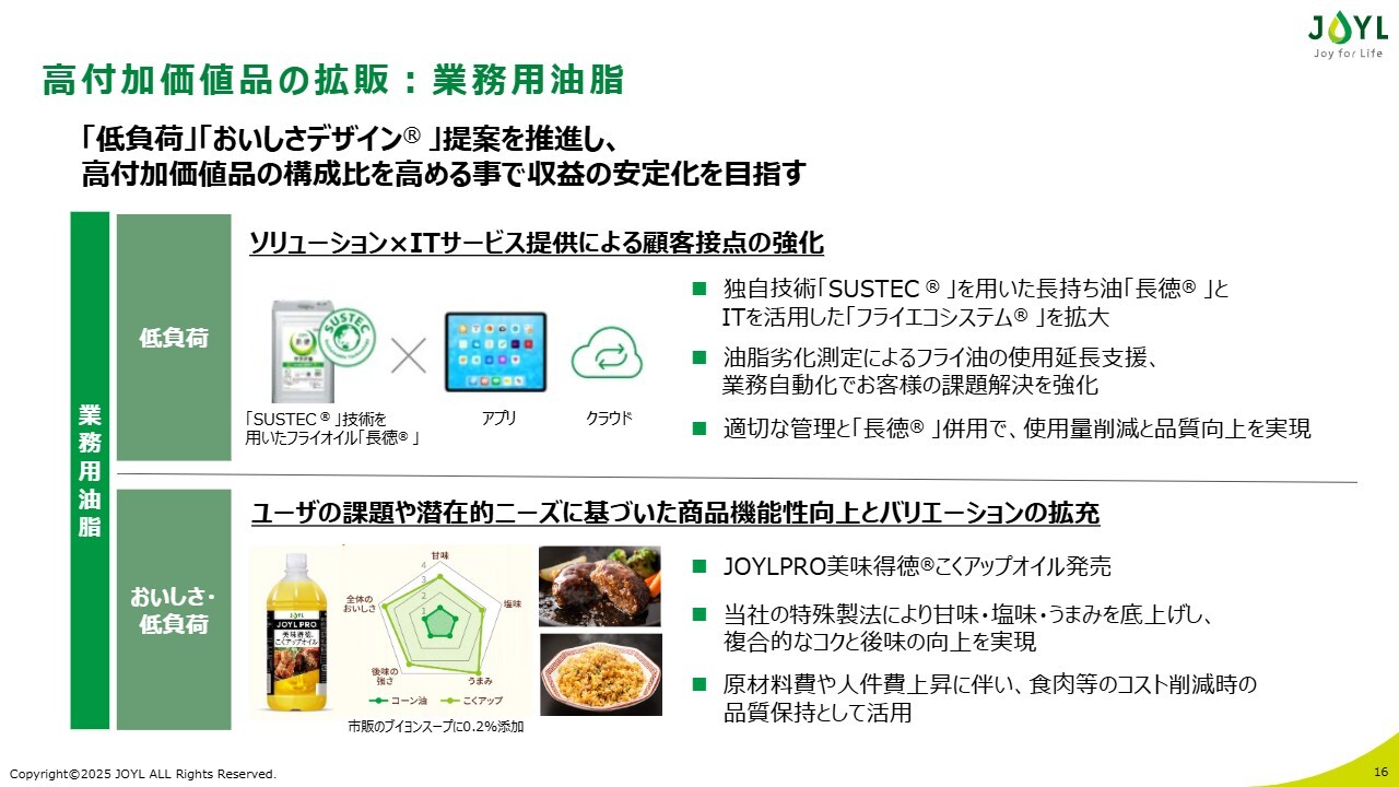 また、「おいしさデザインオイル」については、「JOYL(ジェイオイル)PRO」の製品ラインアップの強化にも取り組んでいきます。