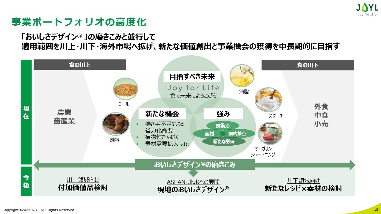 川下のユーザーに対しては、油脂、スターチ、マーガリンなど多様な商品素材を有する当社の強みを活かしながら、新たな素材の活用も視野に入れ、これまでリーチできていなかった市場に新しい「おいしさデザイン」を提供していきたいと考えています。