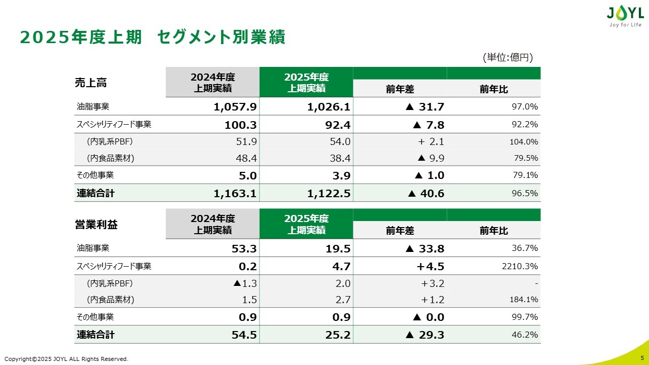 上期の連結売上高は1,122億円、連結営業利益は25億円となり、減収減益となりました。スペシャリティフード事業においては構造改革の効果が着実に現れ、減収ながらも収益が改善しています。一方で、油脂事業においてはコストの上昇に対し、価格改定の反映にタイムラグが生じたため、減収減益となりました。
