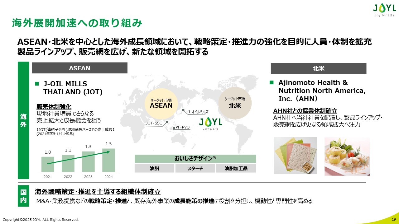 さらに国内では、本年12月1日付で機構改正を行い、これまで1つの組織で担っていた海外戦略の策定および推進業務を、M&A・資本業務提携などの海外戦略を担う組織と、既存海外事業の成長戦略を推進する組織に分割し、それぞれの機能を強化することで、より専門性を高めながら取り組みを加速していきます。