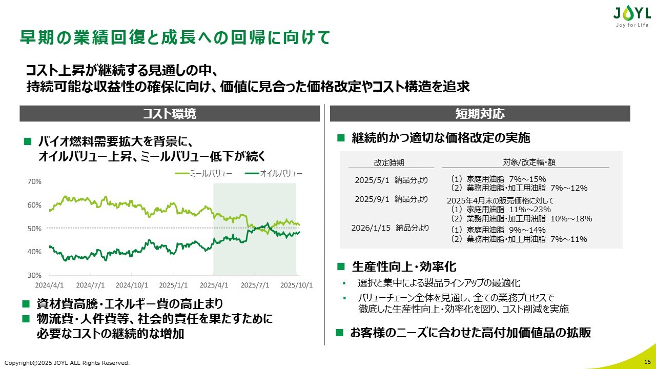 このような状況下で当社は、まず短期的な施策として、先月に今年度3回目となる価格改定を発表し、速やかに適正な価格への改定を進めていきます。さらに、製品ラインアップの選択と集中を図り、収益性の向上に取り組むことで、早期の業績回復を目指します。