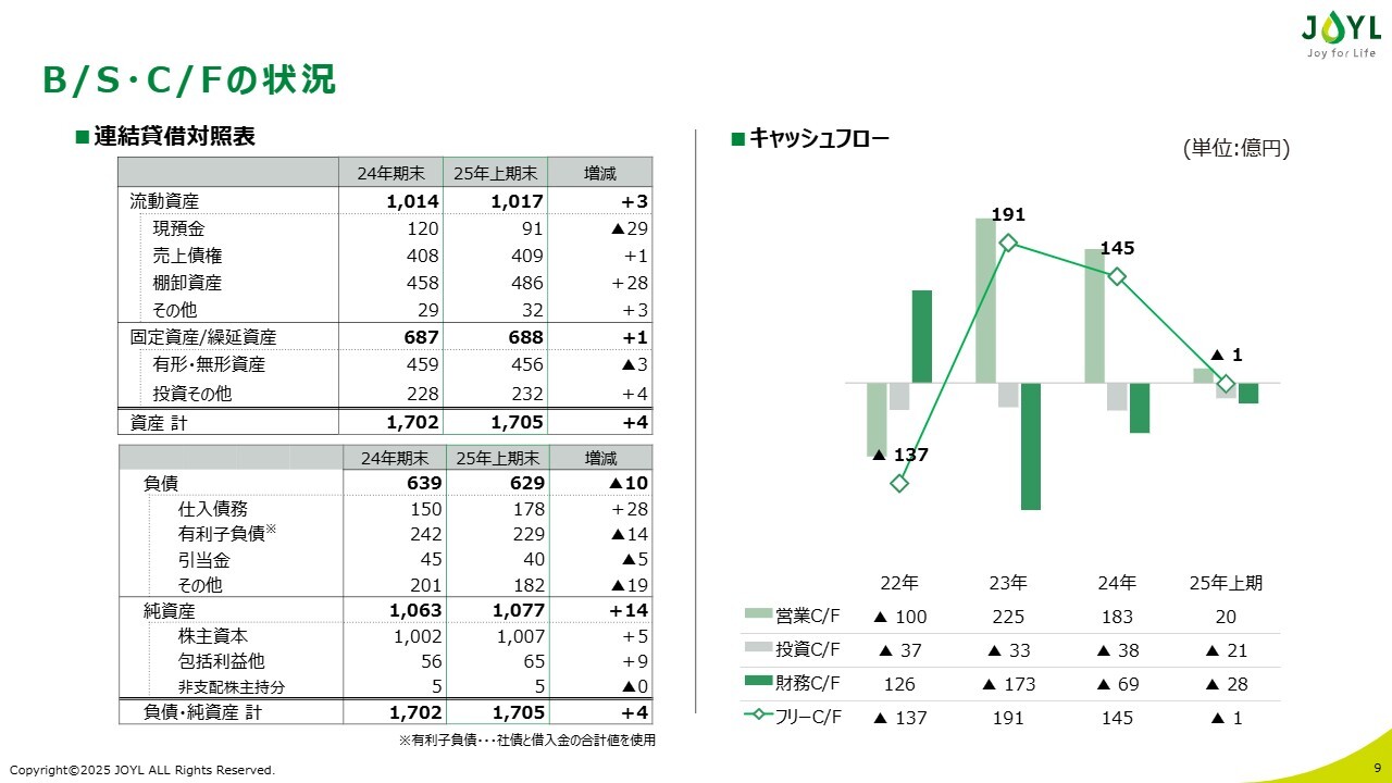 キャッシュフローについては、価格改定の浸透が遅れている影響で営業キャッシュフローが減少しています。しかし、今後、価格改定が徐々に浸透することでコスト上昇分の吸収が進み、収益の改善とともにキャッシュフローの健全化が見込まれます。