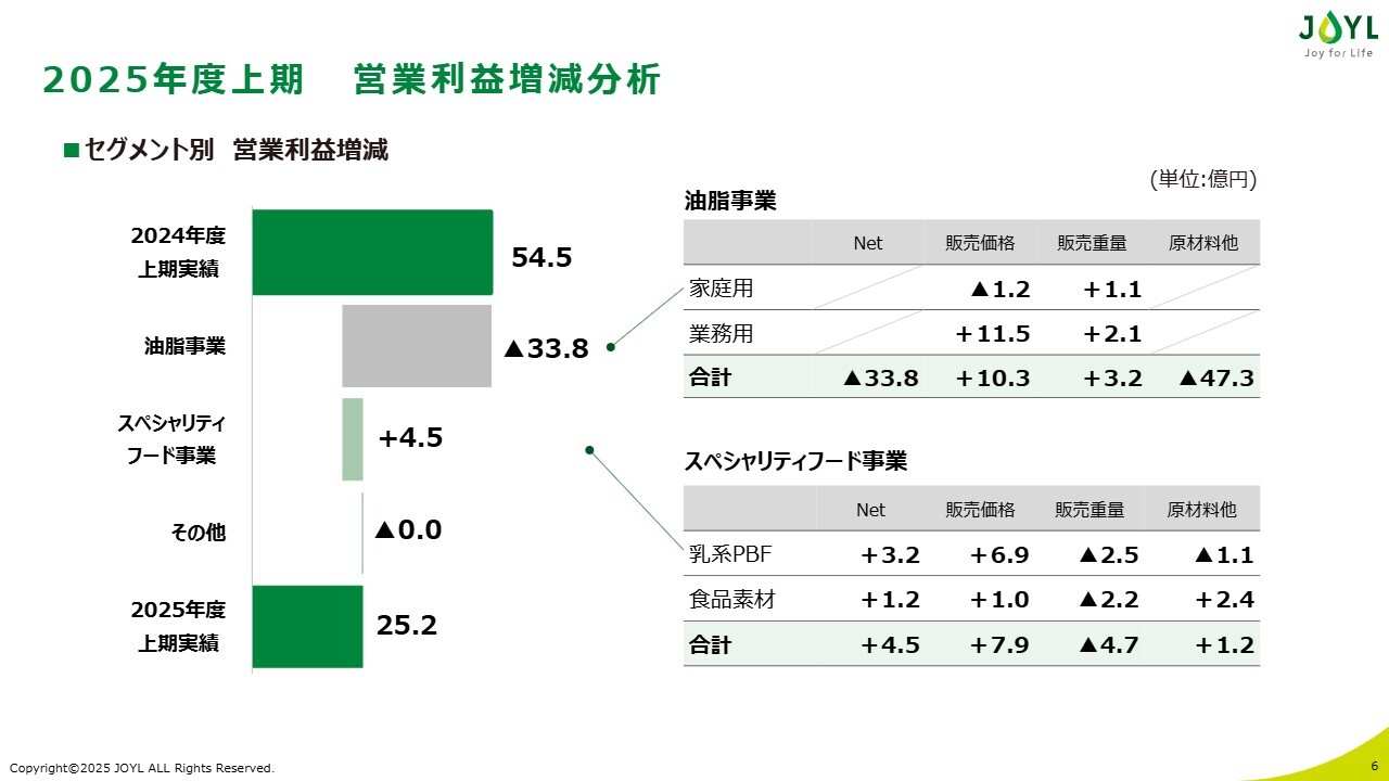 営業利益については、油脂事業を期首予想の83億円から41億円に、スペシャリティフード事業を期首予想の6億円から8億円に変更しました。