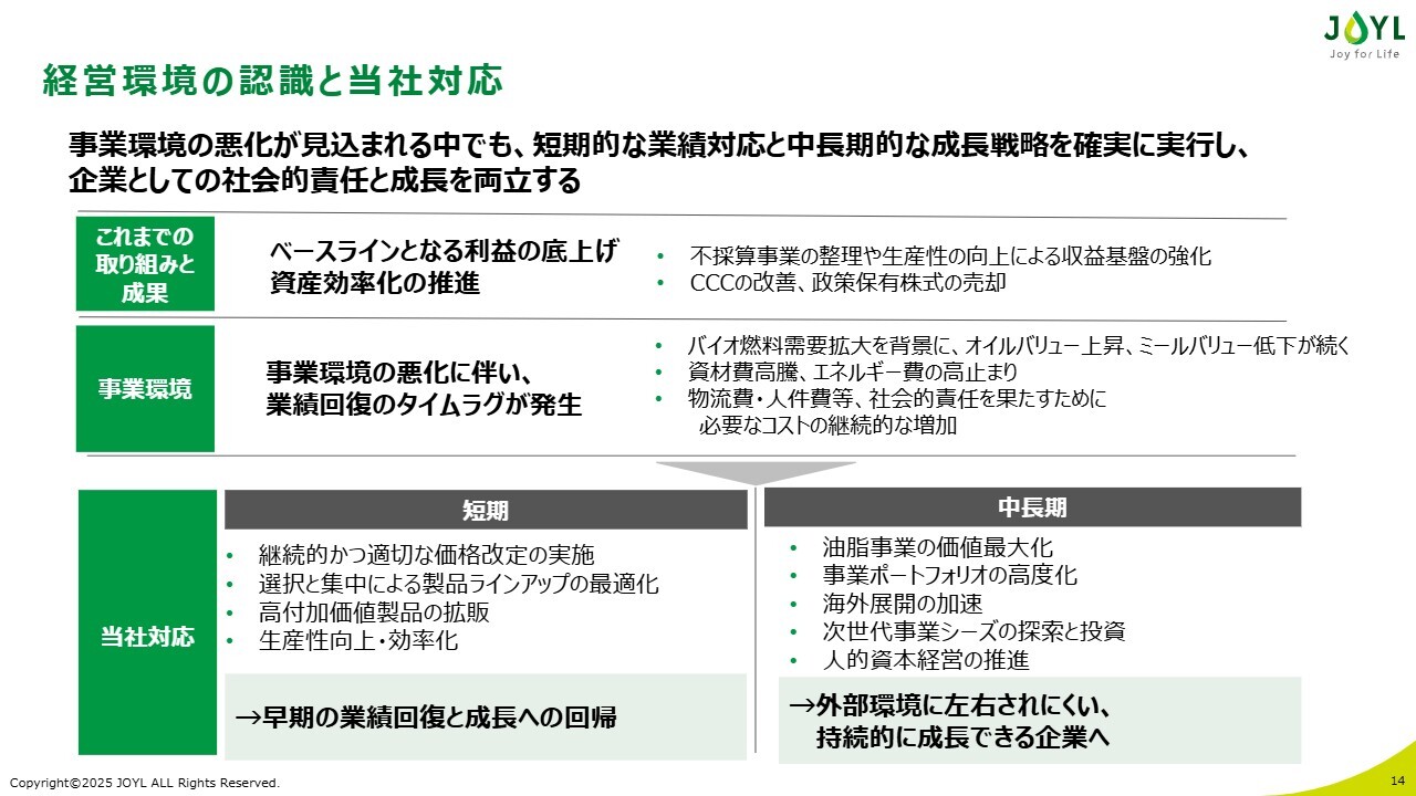 日本経済は緩やかな回復基調で推移していますが、事業環境は依然として厳しい状況です。当社はこのような状況下においても、短期および中長期戦略を着実に実行し、速やかな業績回復と持続的成長を可能にする企業構造の構築を進めていきます。油脂やスターチを活用した高付加価値提案を通じて、食品バリューチェーン全体に貢献し、社会とともに成長する企業を目指していきます。