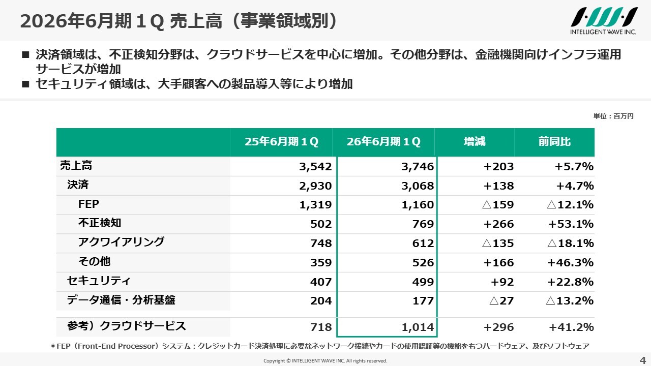 まず、2026年6月期第1四半期の決算状況です。主力である決済領域が堅調に推移し、売上高は前年同期比5.7パーセント増の37億4,600万円となりました。