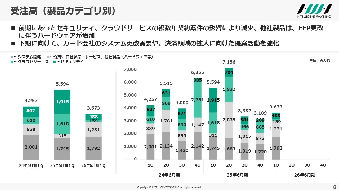 製品カテゴリ別売上高の状況です。システム開発については、前年の大型フロー案件を他の案件の獲得でカバーすることができず、前年同期比で減少しています。