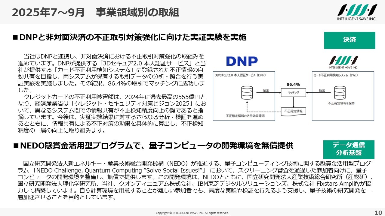 この仕組みの価値提供の方法については現在検討中ですが、以前からお伝えしている業界横断型の不正対策の取り組みの1つであり、DNPとの連携を強化することで、より一層価値を提供し、スピード感を持ってビジネス化につなげていきたいと考えています。