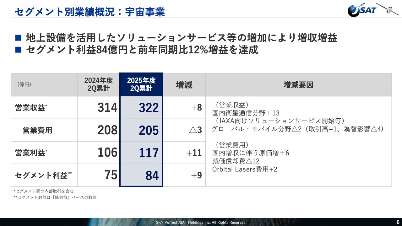 セグメント別の説明に移ります。まず、宇宙事業についてです。営業収益は322億円、前年同期比8億円の増収となっています。詳細は後ほど宇宙事業担当の山下よりご説明しますが、JAXA向け「近地球追跡ネットワークサービス」を含む国内外の地上設備を活用したソリューションサービス等の増加が主な要因です。