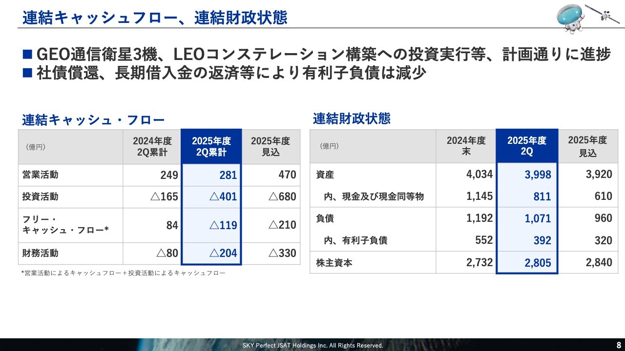 また、静止軌道衛星3基の新規調達や低軌道地球観測衛星のコンステレーション構築も、段階的に進めています。下期も計画どおりに投資を実行し、通期では約700億円の投資を見込んでいます。以上により、フリー・キャッシュ・フローはマイナス119億円となりました。