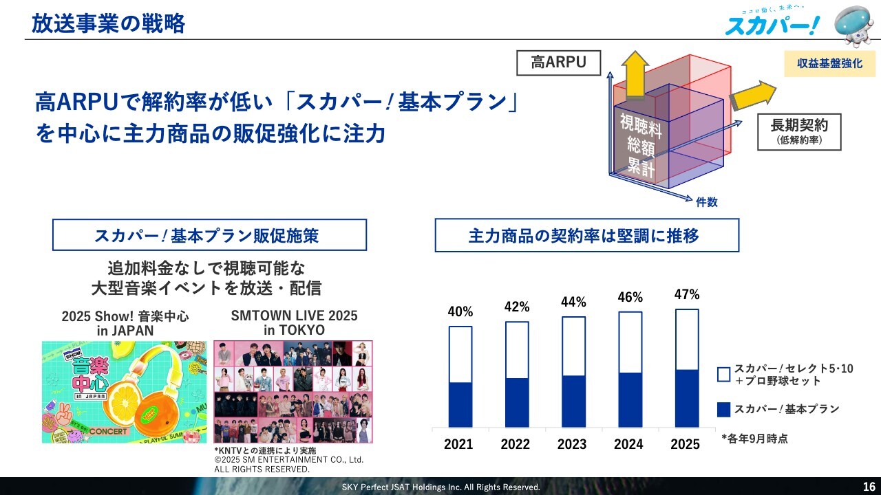 放送事業では引き続き、加入件数減少による視聴料総額の減少を軽減するため、スライド右側の図にあるように、ARPU(視聴料単価)の向上や契約期間の長期化に取り組んでいます。特に、高ARPUで解約率が低い「スカパー基本プラン」を中心とした主力商品に注力した活動を展開しています。