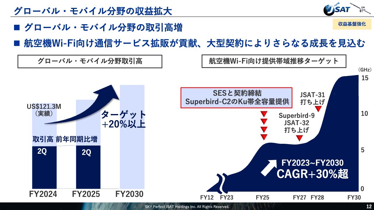 グローバル・モバイル分野の進捗についてご説明します。2025年度上期は為替の影響を一部受けたものの、取引高は前年同期比で増加し、堅調に推移しました。特に航空機Wi-Fi向けの通信サービス需要が引き続き拡大しており、取引高の増加を牽引しています。