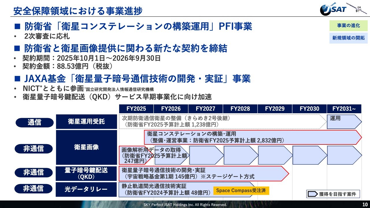 続いて、安全保障領域における取り組みについてご説明します。まず、防衛省による「衛星コンステレーション構築運用」PFI事業については、10月にコンソーシアムパートナーと共同で2次審査に応札しました。現在は12月24日の開札に向け、受注に向けた提案内容の精緻化を進めており、しっかりと取り組んでいきます。