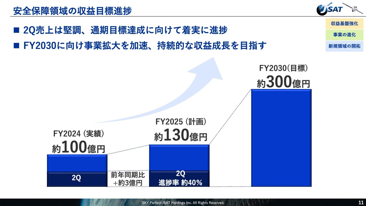安全保障領域における収益の進捗についてご説明します。今年度上期の売上は約50億円となり、前年同期比でおよそ3億円の増加と、堅調に推移しました。通期計画である約130億円に対する進捗率はおおむね40パーセントと、計画どおりのペースで進んでいます。