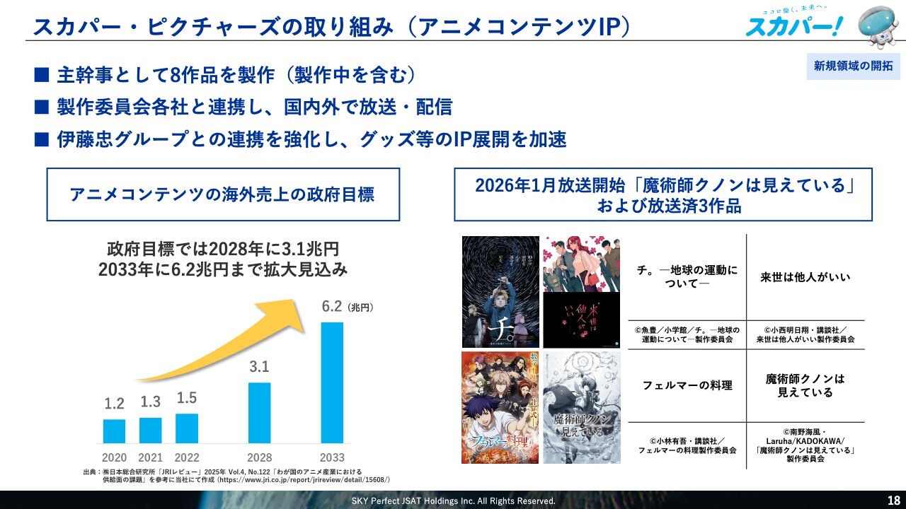 最後に、子会社である株式会社スカパー・ピクチャーズのアニメコンテンツIPに関する取り組みについてご説明します。スカパー・ピクチャーズは、現在製作中のものを含め、主幹事として8作品を製作しています。