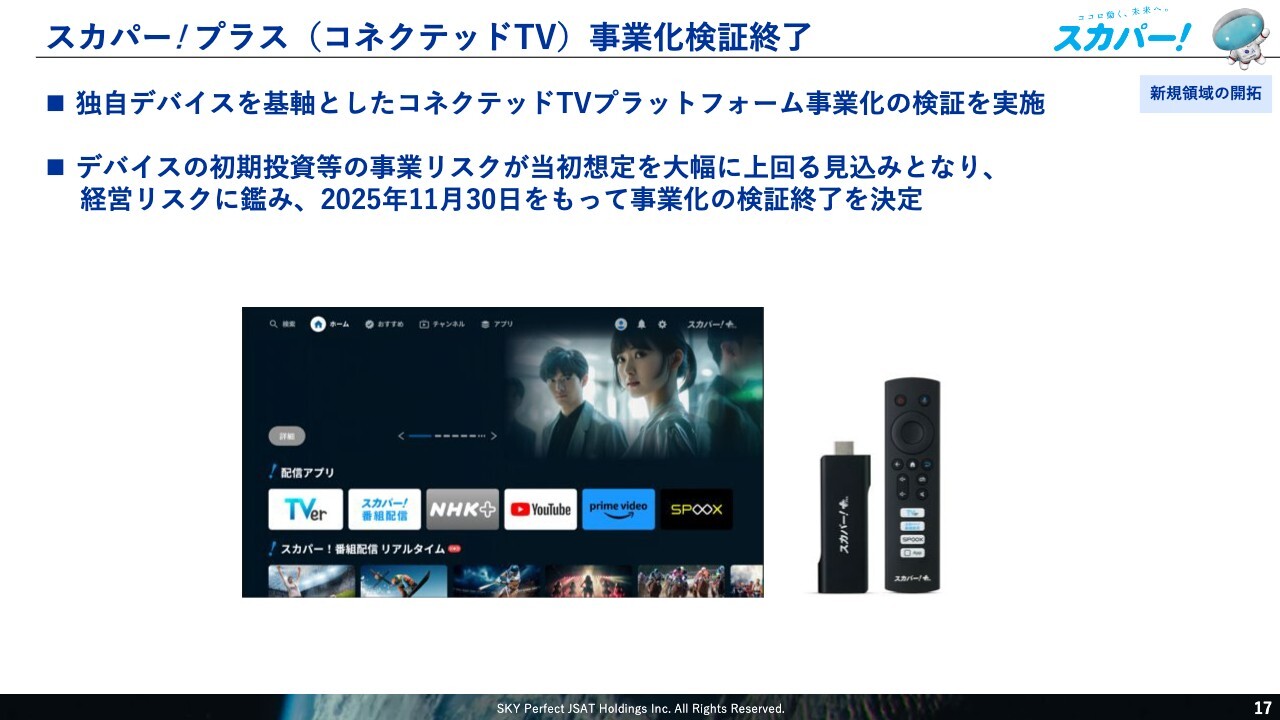 次に、新規領域の開拓についてご説明します。「スカパー +(プラス)」の事業化検証については、テレビに挿して使用する独自のデバイスを開発し、2024年10月からモニターのみなさまに当社の番組配信サービスだけでなく、TVer、YouTube、Prime Videoなどの多彩な動画配信サービスを提供してきました。