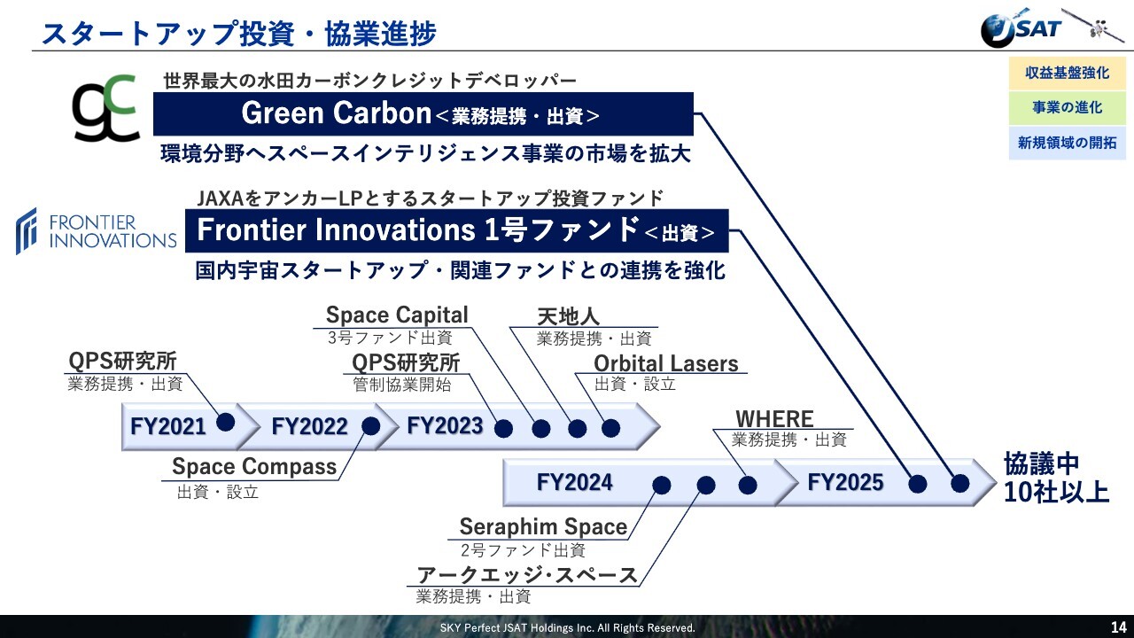 スタートアップへの投資および協業の進捗についてご説明します。当社は、宇宙産業の持続的な成長と新たな市場創出を目指し、スタートアップとの連携を積極的に推進しています。