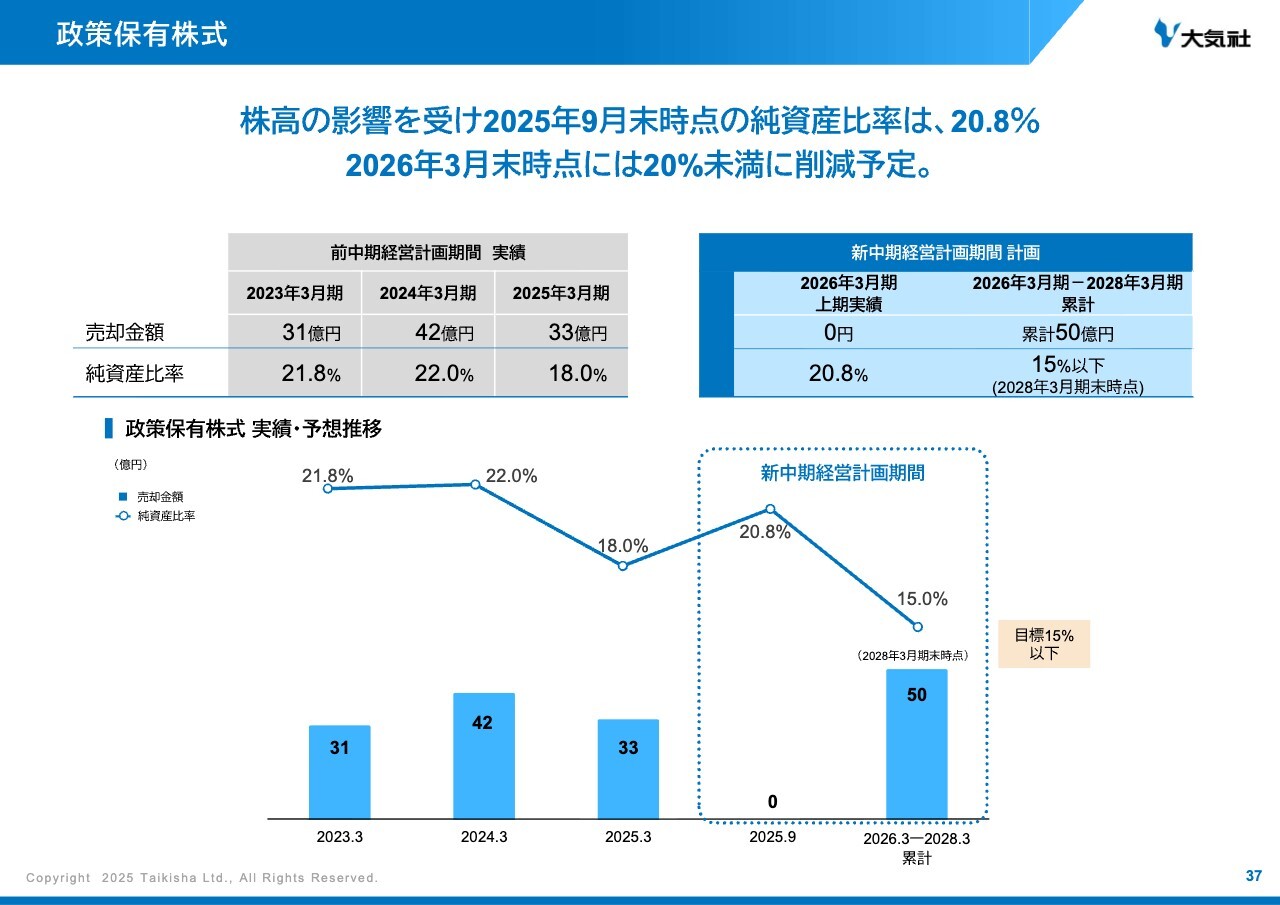 2026年3月期上期は、政策保有株式の売却は実施していませんが、2026年3月期末時点には、20パーセント未満に削減予定です。