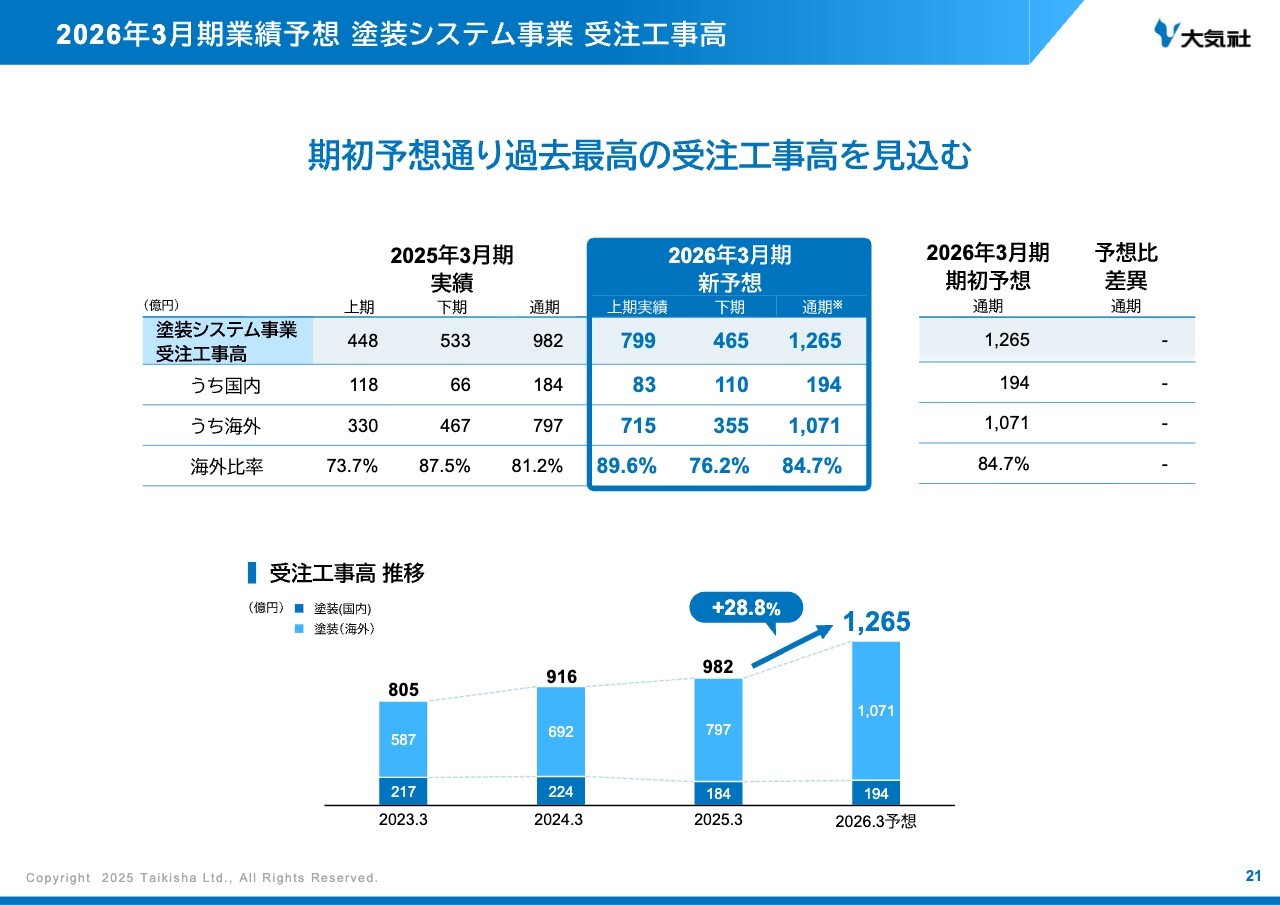 市場環境は引き続き良好であり、塗装システム事業の受注工事高は、期初予想どおりの1,265億円となる見通しです。塗装システム事業においても、過去最高の受注工事高を見込んでいます。