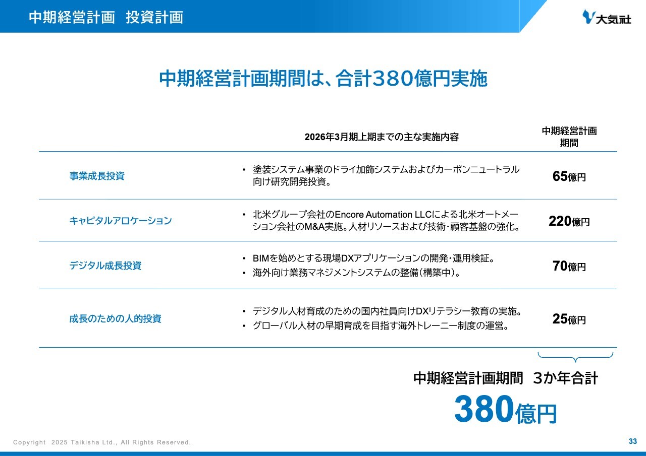 足元では、国内を中心に受注時の採算性が改善傾向にあり、施工体制構築と生産性向上を進めることで利益の改善を図りつつ、長期的な成長に資する戦略の実行を両立させていきます。私からのご説明は以上です。