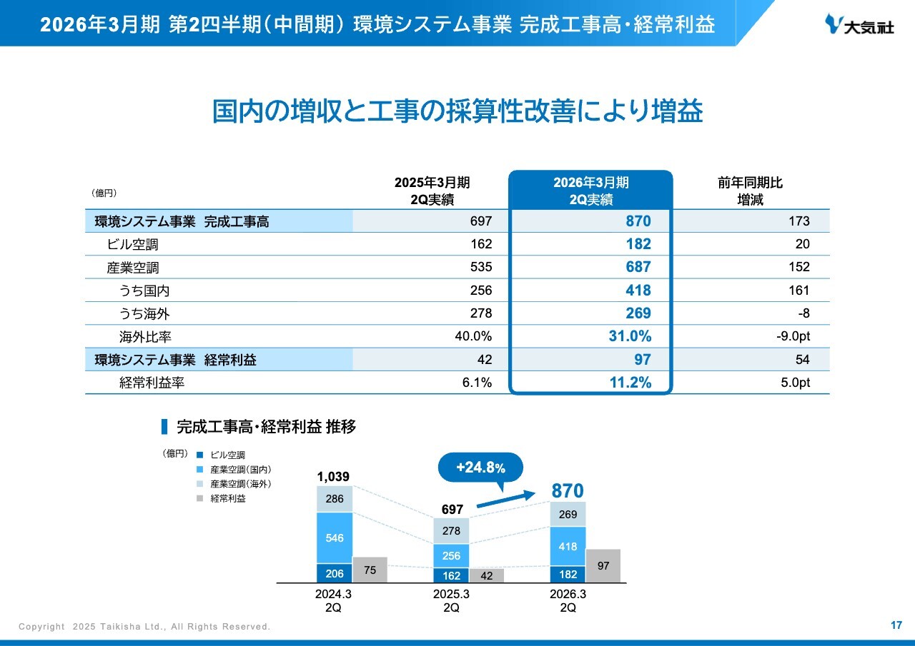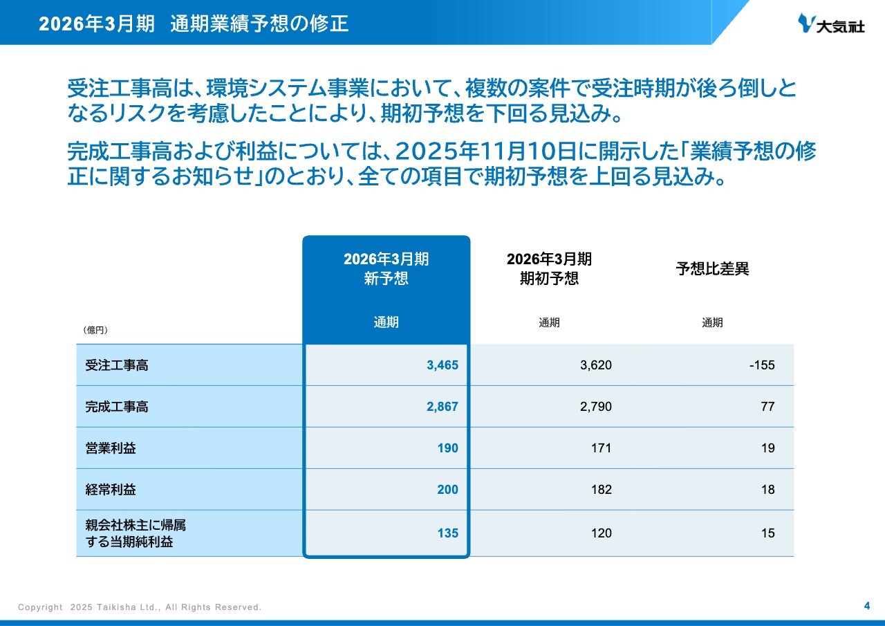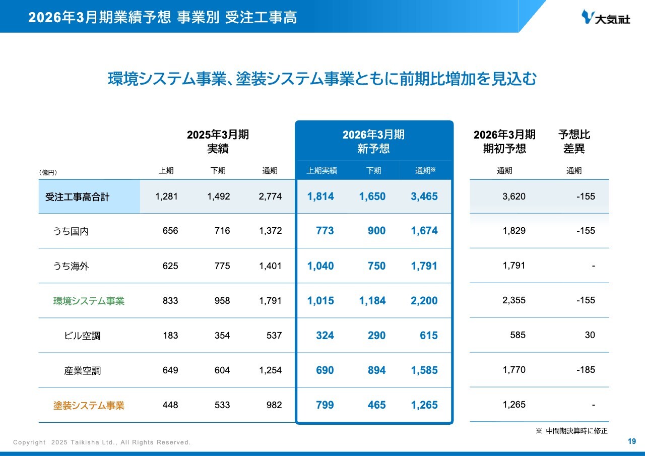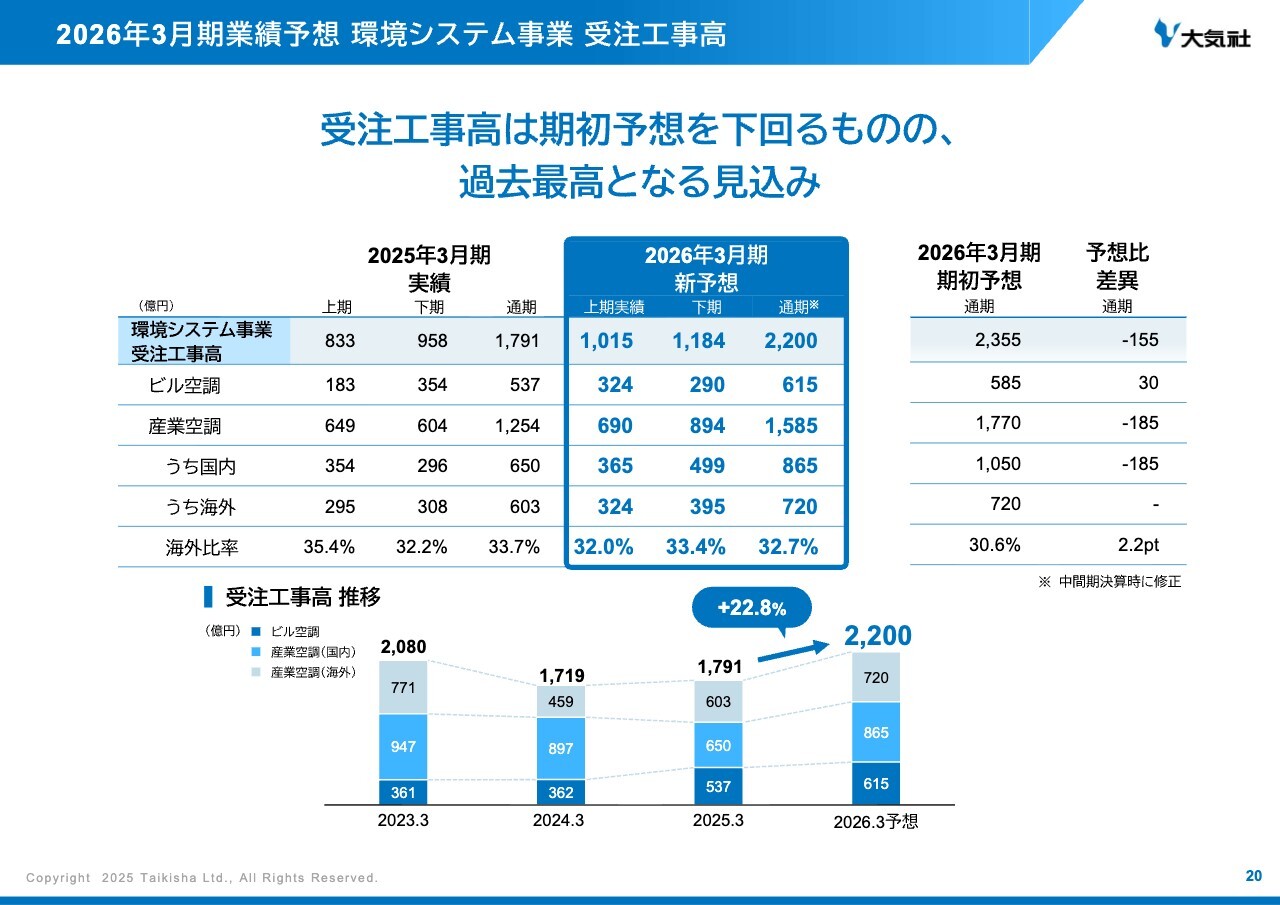 受注工事高は、環境システム事業において、複数の案件で受注時期が後ろ倒しとなるリスクを考慮したことにより、期初予想を下回る見込みです。完成工事高は、主に国内において想定以上に工事の進捗が見込まれることから期初予想を上回る見込みです。