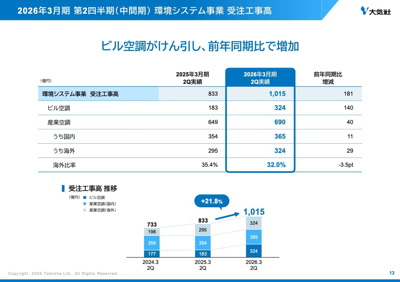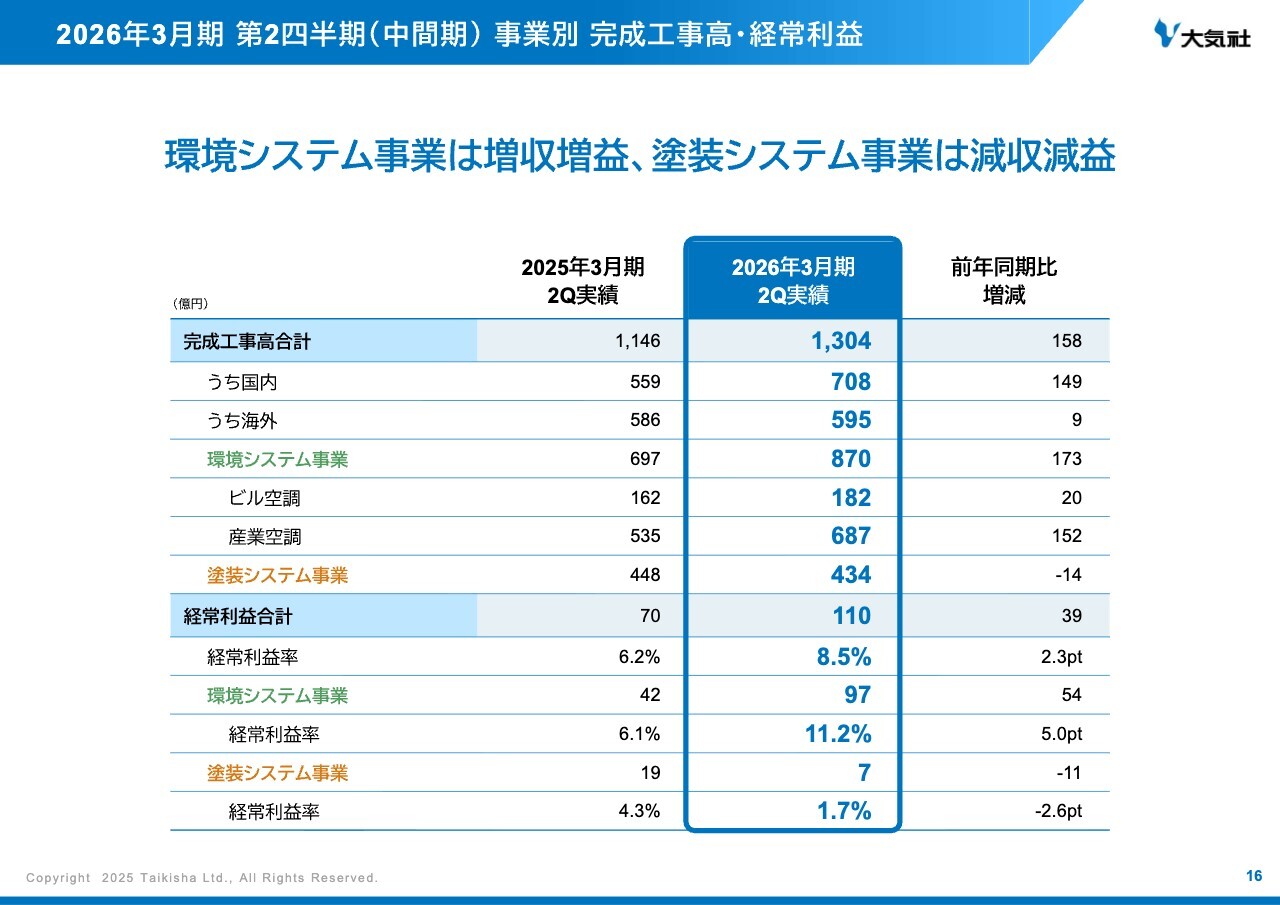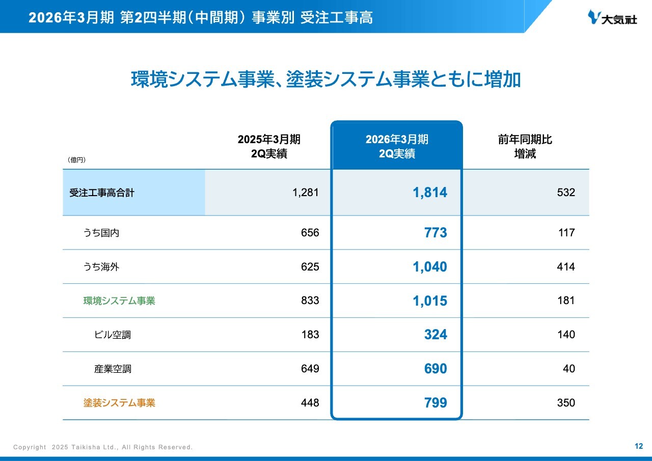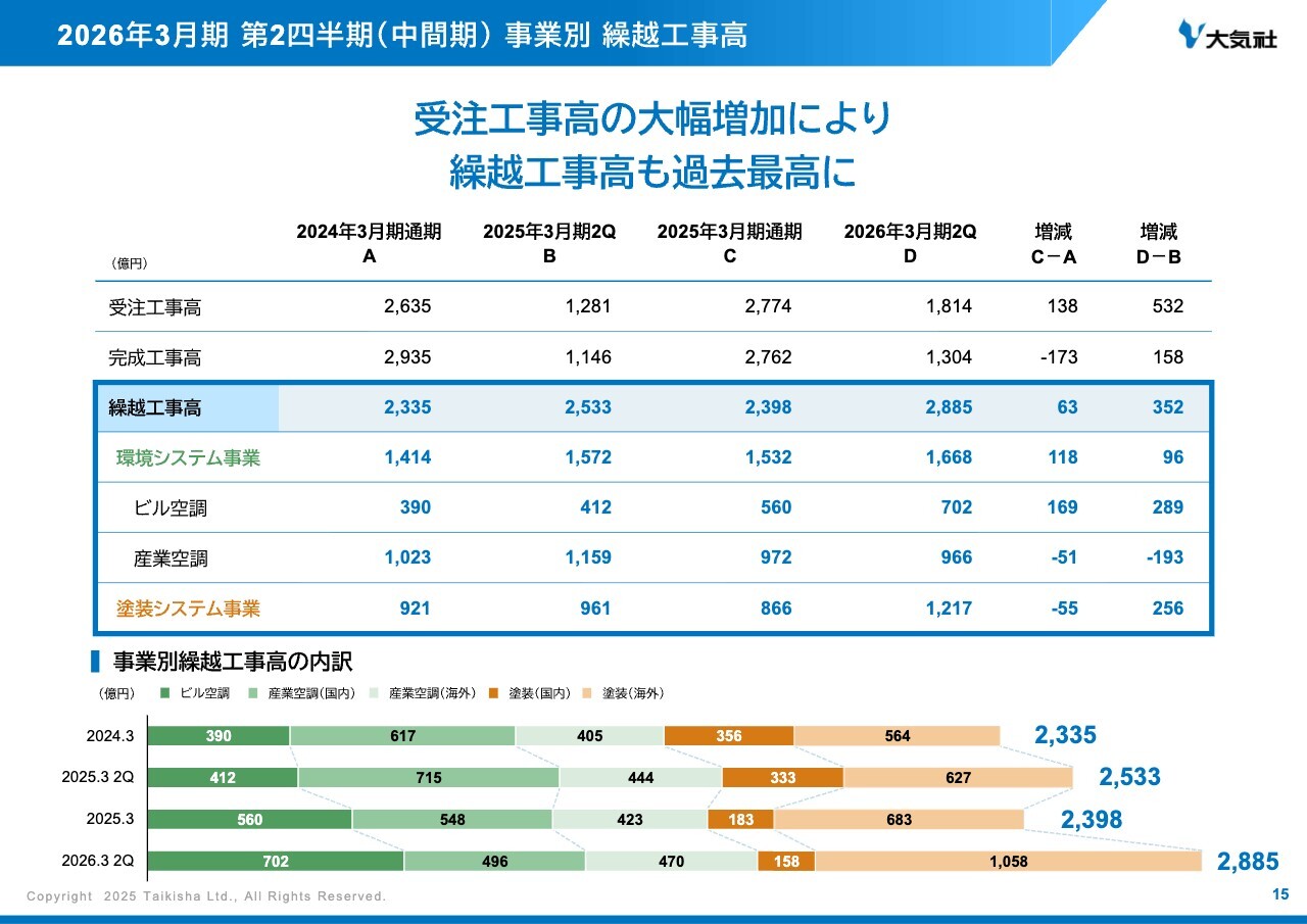 2026年3月期上期は、環境システム事業、塗装システム事業ともに、期初から手持ち案件が積みあがっており、繰越工事高としても過去最高の2,885億円となりました。