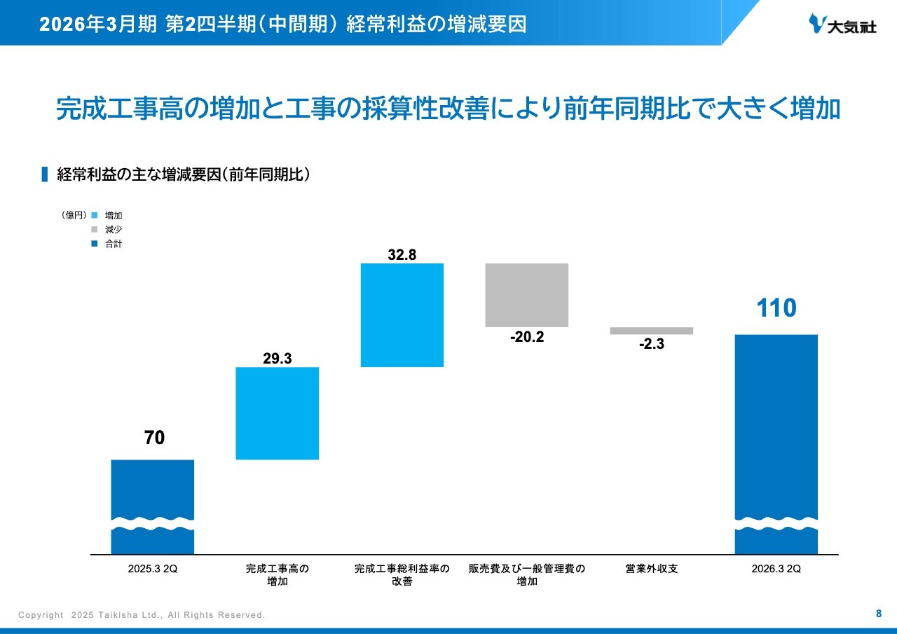 人件費や成長投資を中心とした販管費の増加があったものの、先ほどご説明したとおり、増収効果と工事の採算性改善により前年同期比で大きく増加しました。