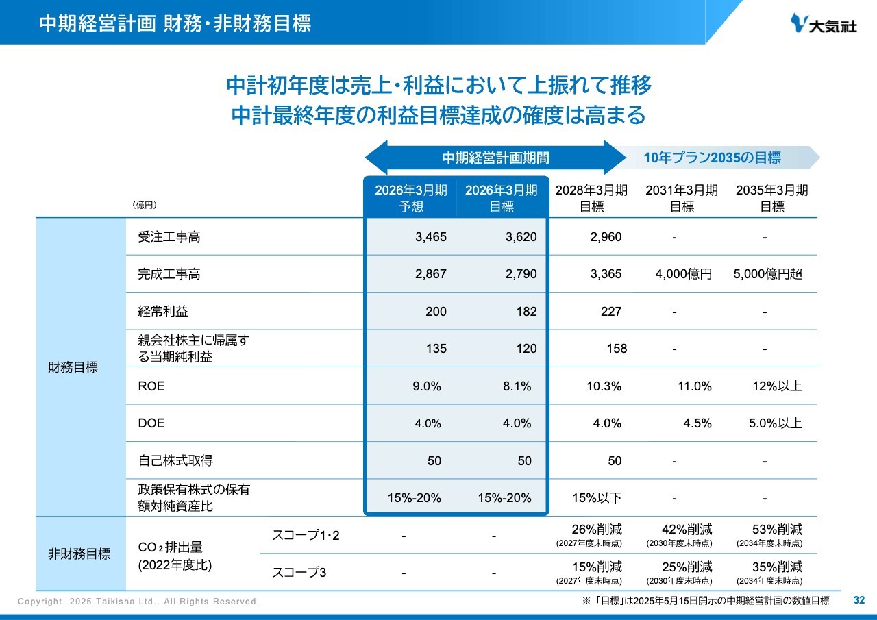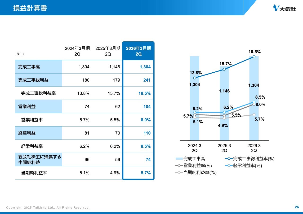 2026年3月期の業績予想に関しては、先ほど社長の長田が申し上げたとおり、受注を除くすべての項目において、中計で掲げている目標を達成する見通しです。足元では工事の採算性が改善しており、中計最終年度の目標達成の確度は高まっています。
