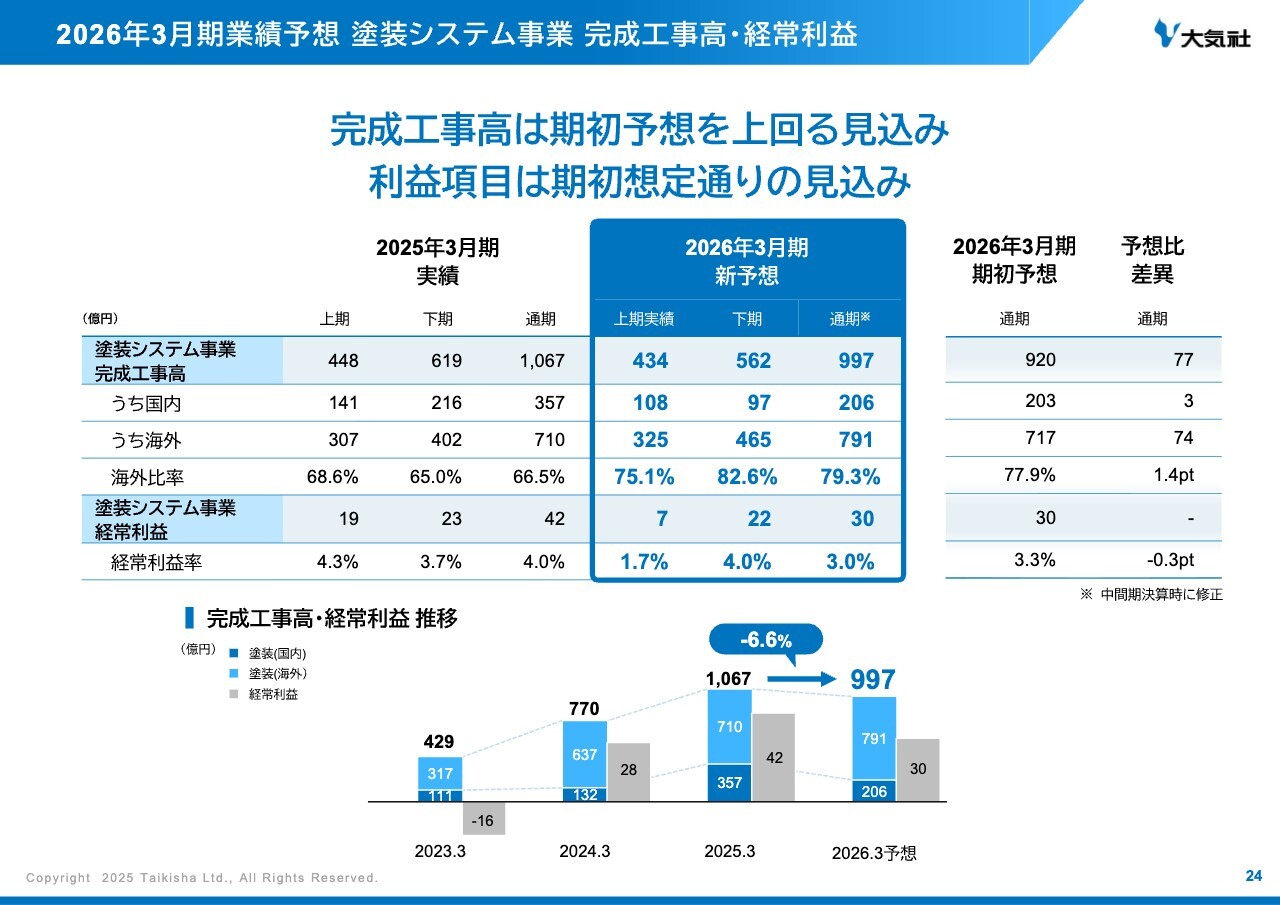 2026年3月期業績予想 塗装システム事業 完成工事高・経常利益