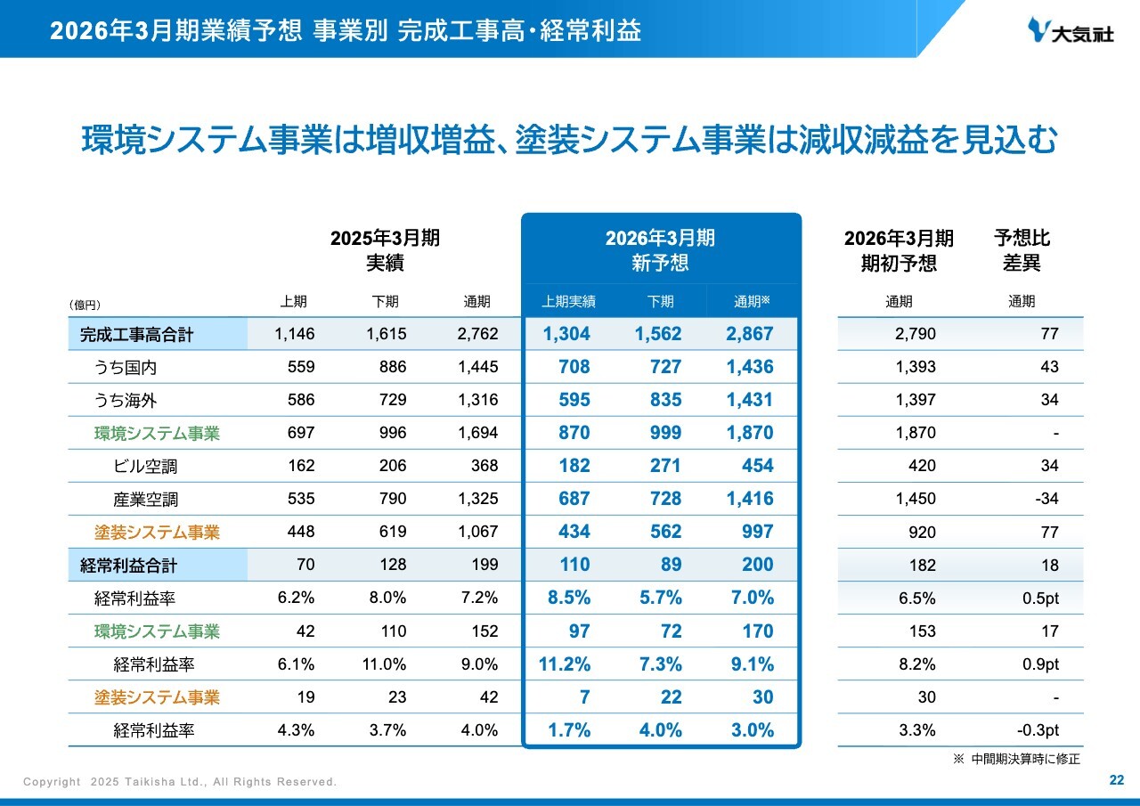 完成工事高は、塗装システム事業で減少するものの、環境システム事業で増加し、全社では前期比104億円の増加で2,867億円となる見通しです。