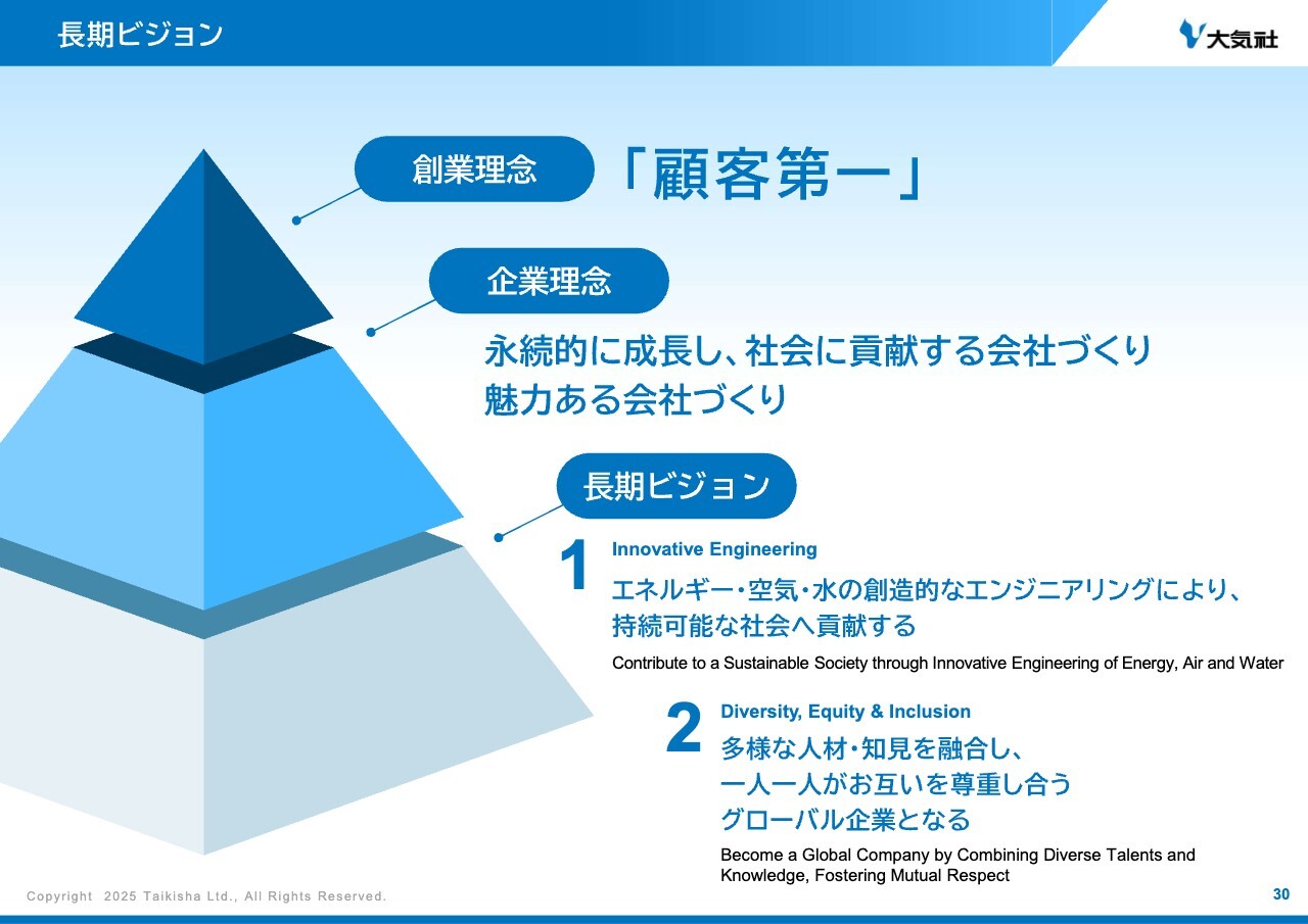 スライドは、本中計の策定にあたり見直した長期ビジョンを記載しています。「Innovative Engineering」と「Diversity, Equity & Inclusion」という2つのビジョンを掲げています。