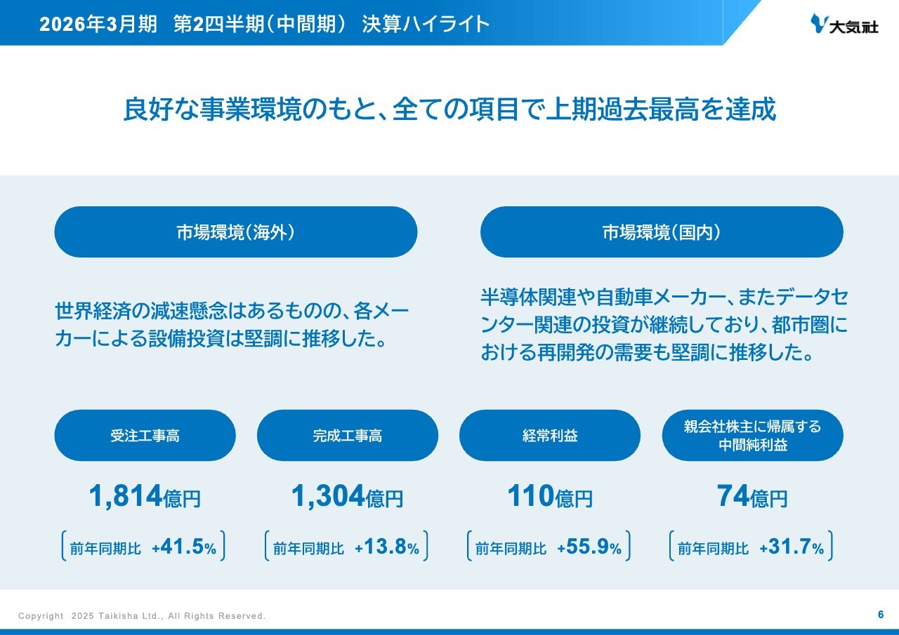 そのような市場環境のもと、すべての項目で前年同期を上回り、またすべての項目で上期過去最高を達成しました。