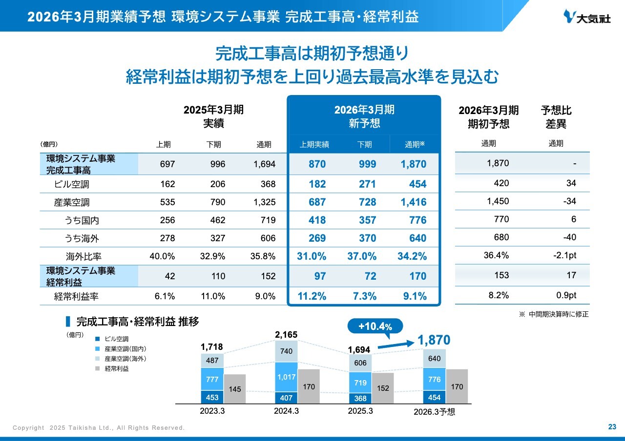 新予想においては、完成工事高は、産業空調の減少をビル空調の増加でカバーすることで、期初予想どおりの1,870億円となる見通しです。次に経常利益は、主に上期竣工案件の採算性の改善が期初の想定を上回ったことにより、期初予想を17億円上回る170億円となる見通しです。
