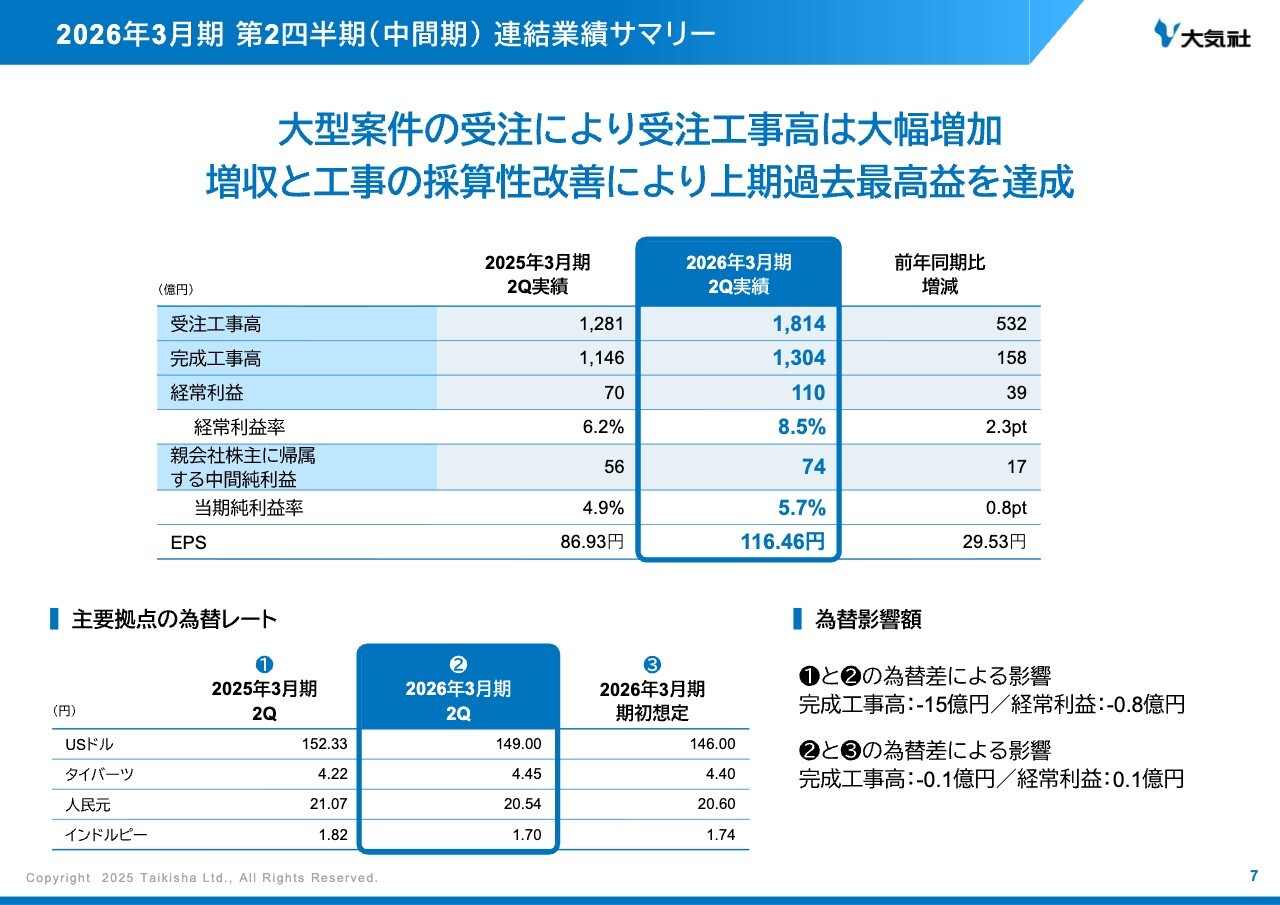 次に経常利益は、完成工事高減と人件費増や成長投資を中心とした販管費増の影響により、前年同期比11億円減の7億円となりました。