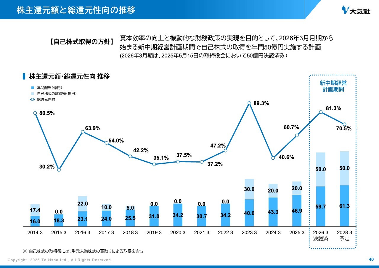 薄いブルーの棒グラフで自己株式の取得額の推移を示しています。自己株式取得に関しては、本中計で年間50億円、3年間合計で150億円実施する予定です。配当と自己株式の取得を合わせて、より高い水準の株主還元を目指します。