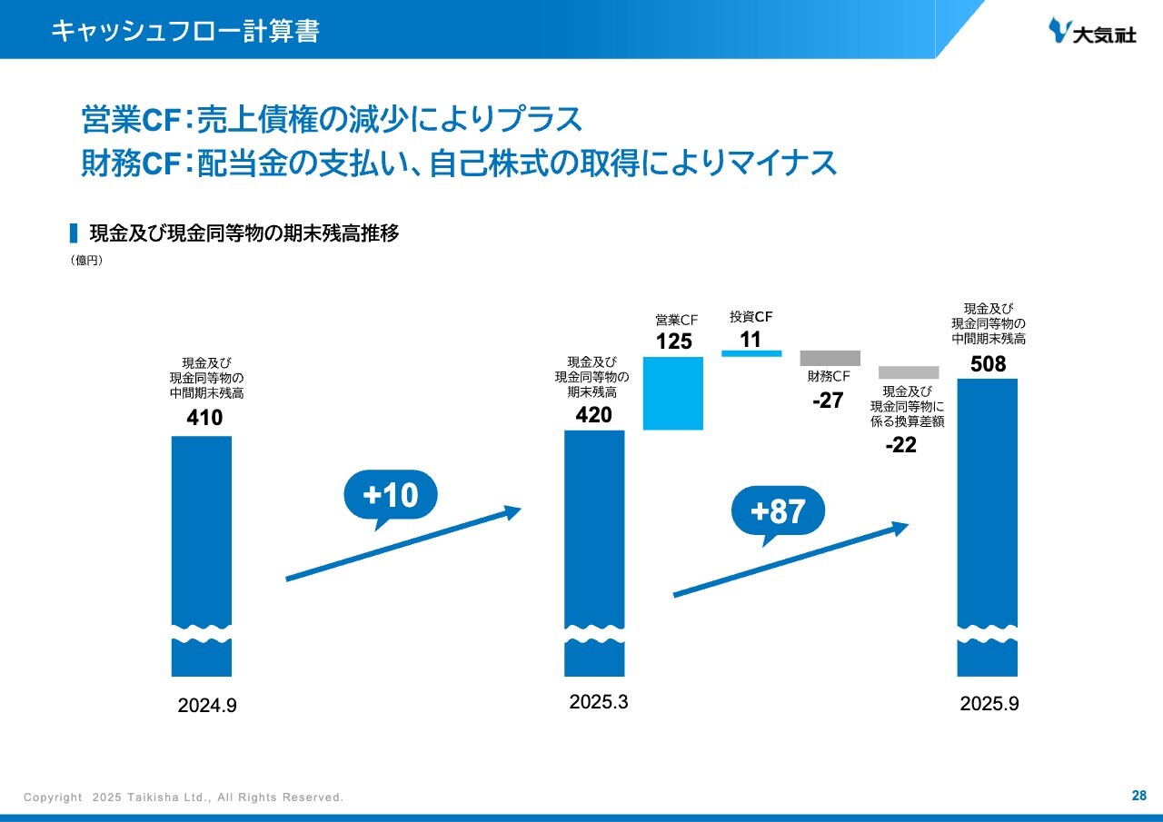 2026年3月期第2四半期の現金及び現金同等物の期末残高は、2025年3月期末より87億円増加し、508億円となりました。