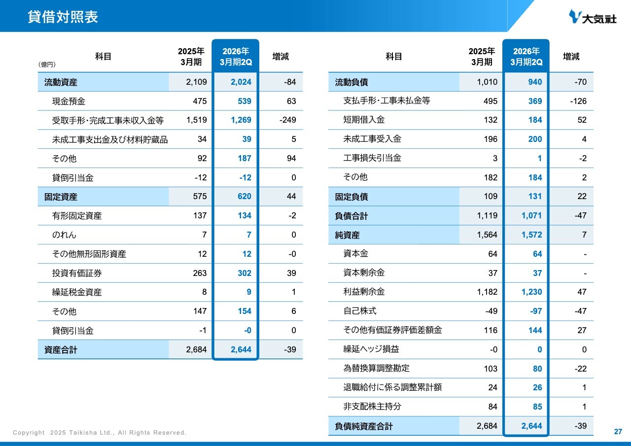 財務キャッシュフローは、工事業者への支払い等の立替資金需要による短期借入金の増加があったものの、配当金の支払いや自己株式の取得により、27億円のマイナスとなりました。