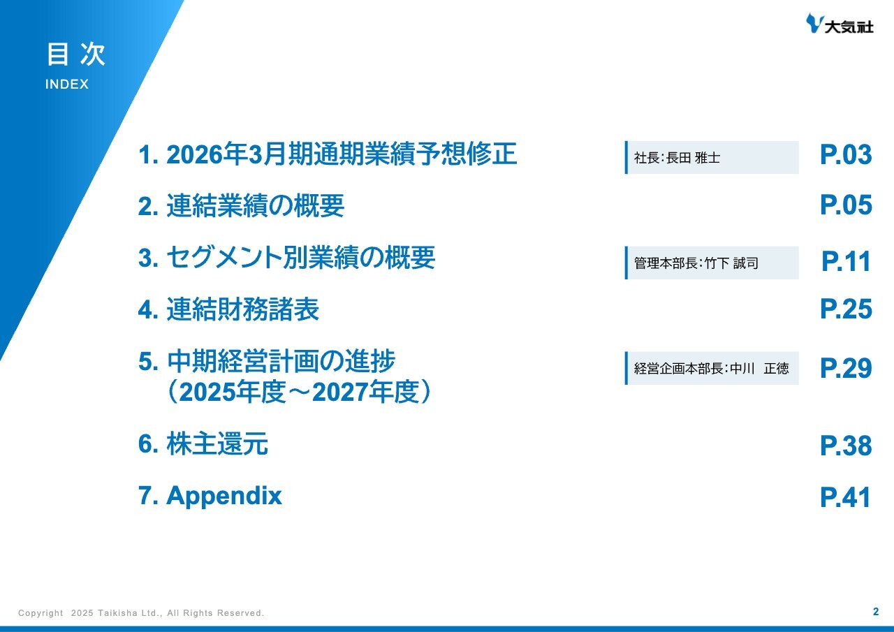 長田雅士氏:社長の長田です。本日は、弊社の決算説明会にご参加いただき、誠にありがとうございます。私からは、2026年3月期通期業績予想の修正、2026年3月期上期の市場環境と業績、2026年3月期業績予想・見通しについてご説明します。