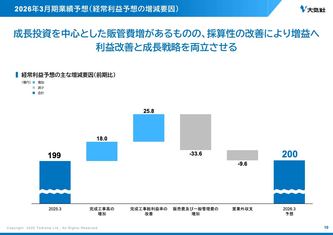 利益に関しては、人件費と成長投資を中心とした販管費増があるものの、完成工事高の増加と完成工事総利益率の改善により、経常利益は200億円で過去最高となる見通しです。