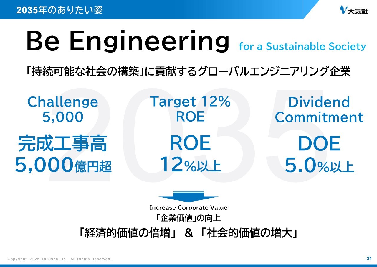 10年プランの最終年である2035年3月期には、完成工事高5,000億円超、ROE12パーセント以上、DOE5パーセント以上という目標を掲げました。社会課題の解決を通じて、当社の経済的価値を倍増させ、企業価値を高めていきます。