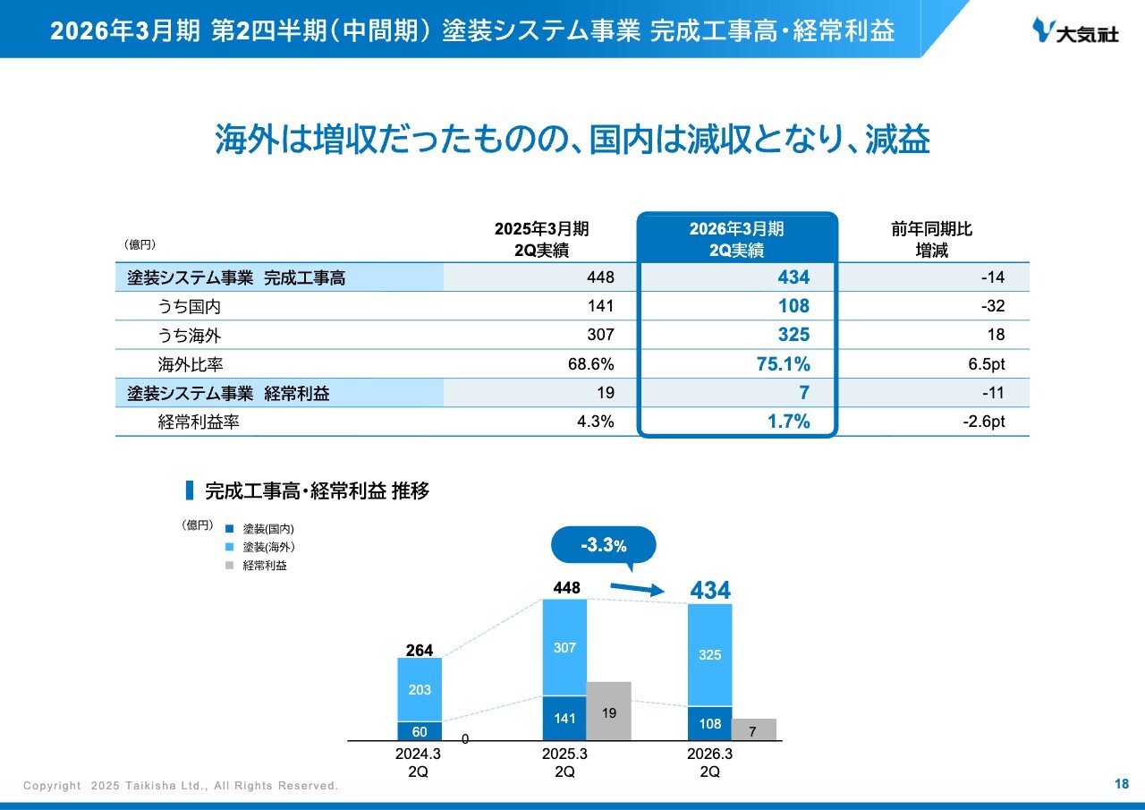 2026年3月期 第2四半期(中間期) 塗装システム事業 完成工事高・経常利益