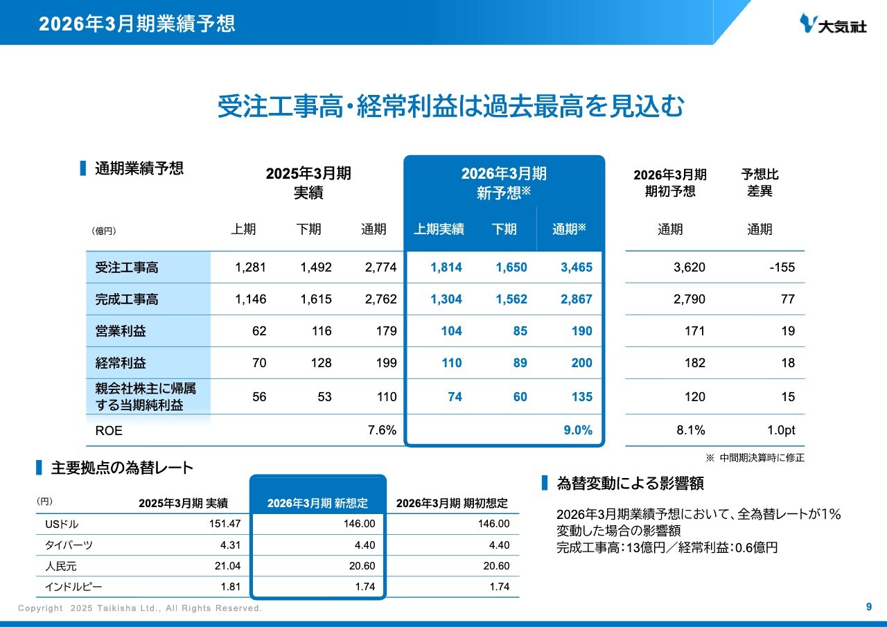 利益面については、主に国内の工事の採算性改善により、営業利益、経常利益及び親会社株主に帰属する当期純利益は期初予想を上回る見込みです。