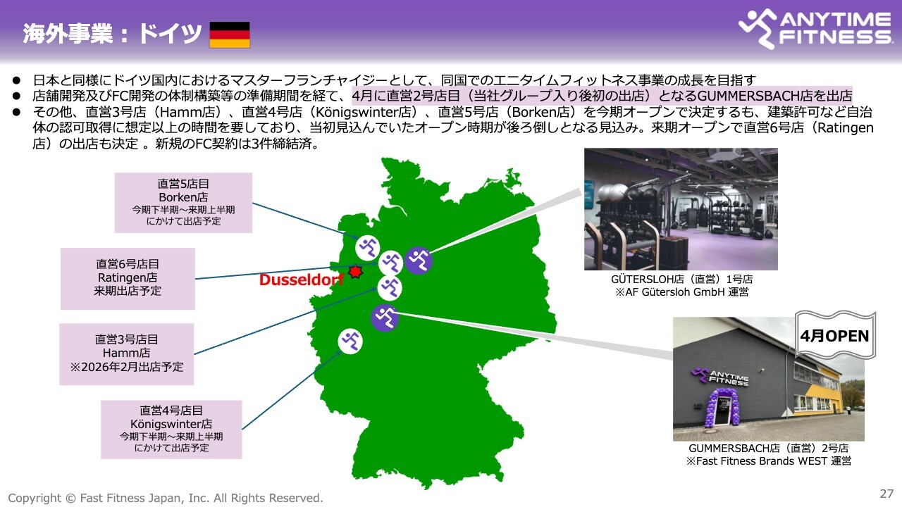 今後の展開については、先ほどご説明したとおり、ドイツでは5号店目、6号店目までの計画がすでに決定しており、建築許可が下り次第、順次開店していきます。我々の見解では、ドイツは日本よりもフィットネス参加率が非常に高い国であり、競合は多いものの、当社の目指す中間価格帯のブランドは非常に少ないです。したがって、現在が進出の好機と判断しています。