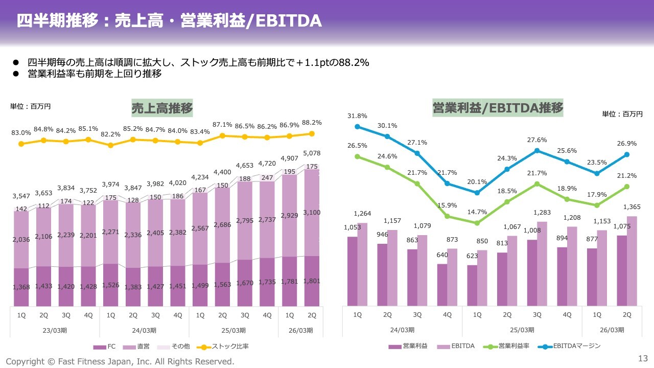 四半期ごとの推移についてです。売上高は、会員数の着実な増加と店舗ネットワークの拡大を背景に、四半期を通じて安定的な成長を継続しています。