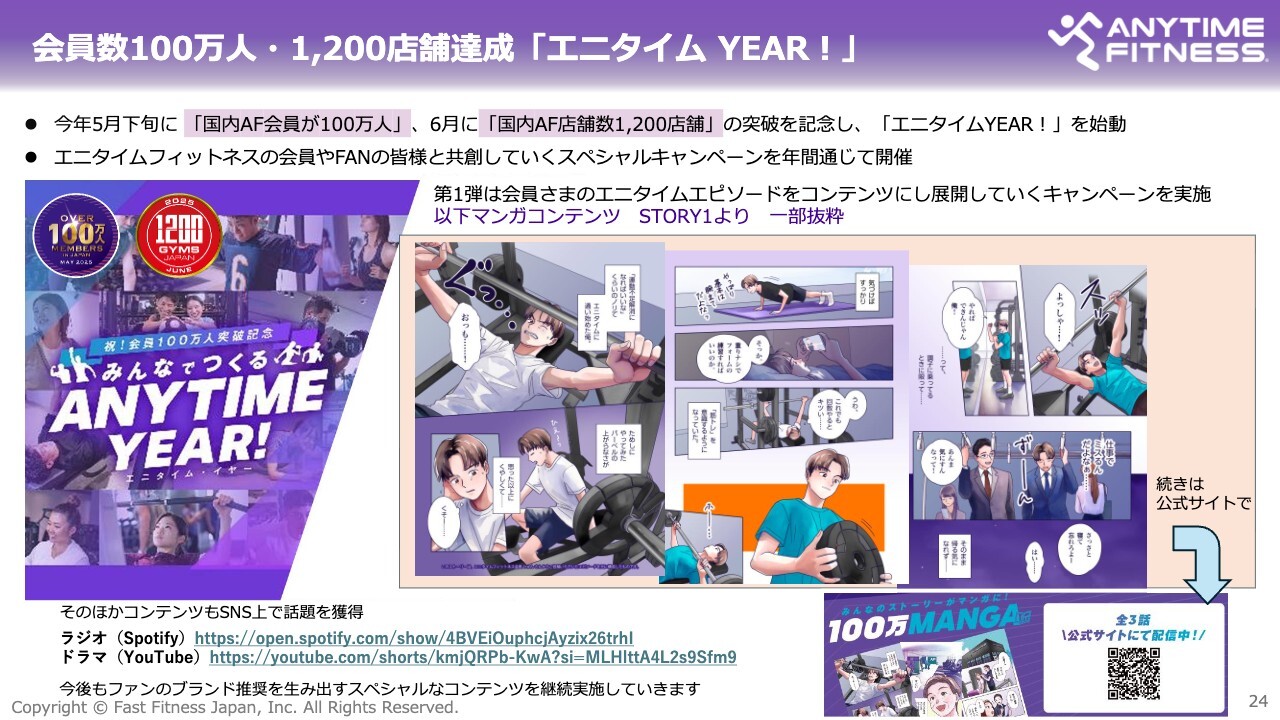 本日はご清聴いただき、誠にありがとうございました。国内のエニタイムフィットネスの成長はさらに加速しており、会員数は100万人、店舗数は1,200店舗を超え、なおも力強く伸びている状況です。同時に、海外展開、新ブランド、EC・物販といった新たな挑戦も着実に進展しつつあります。