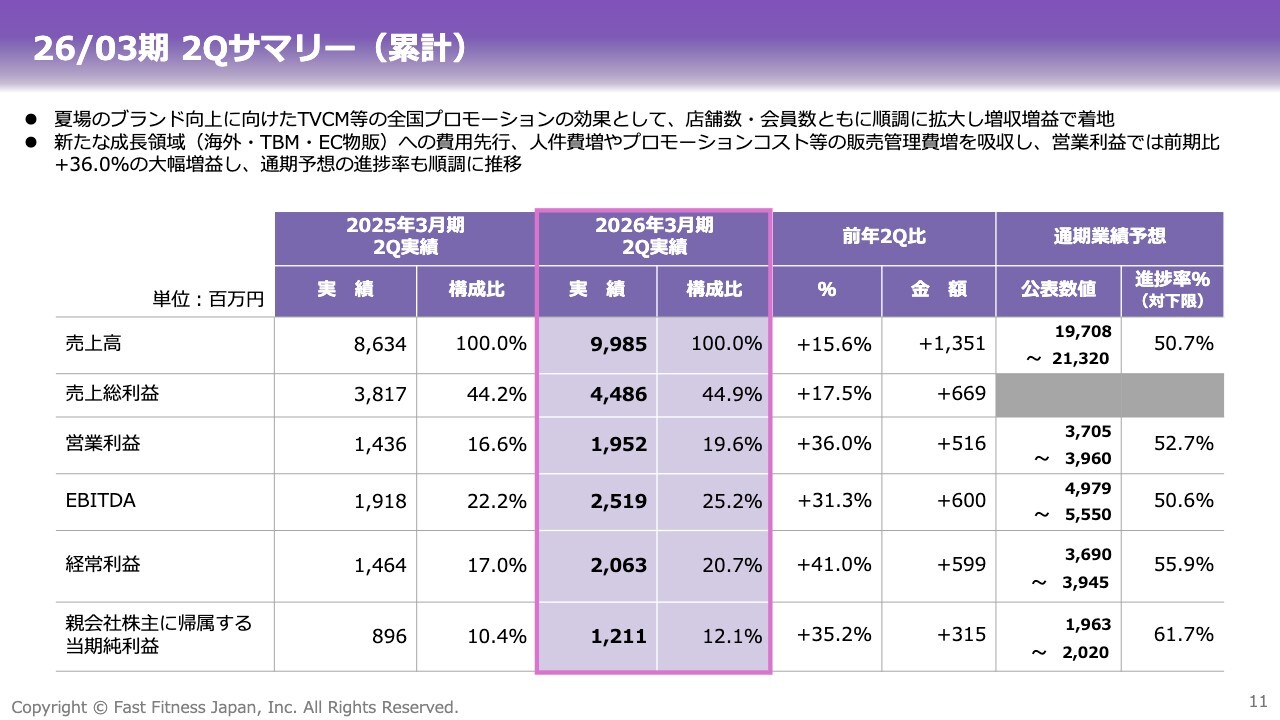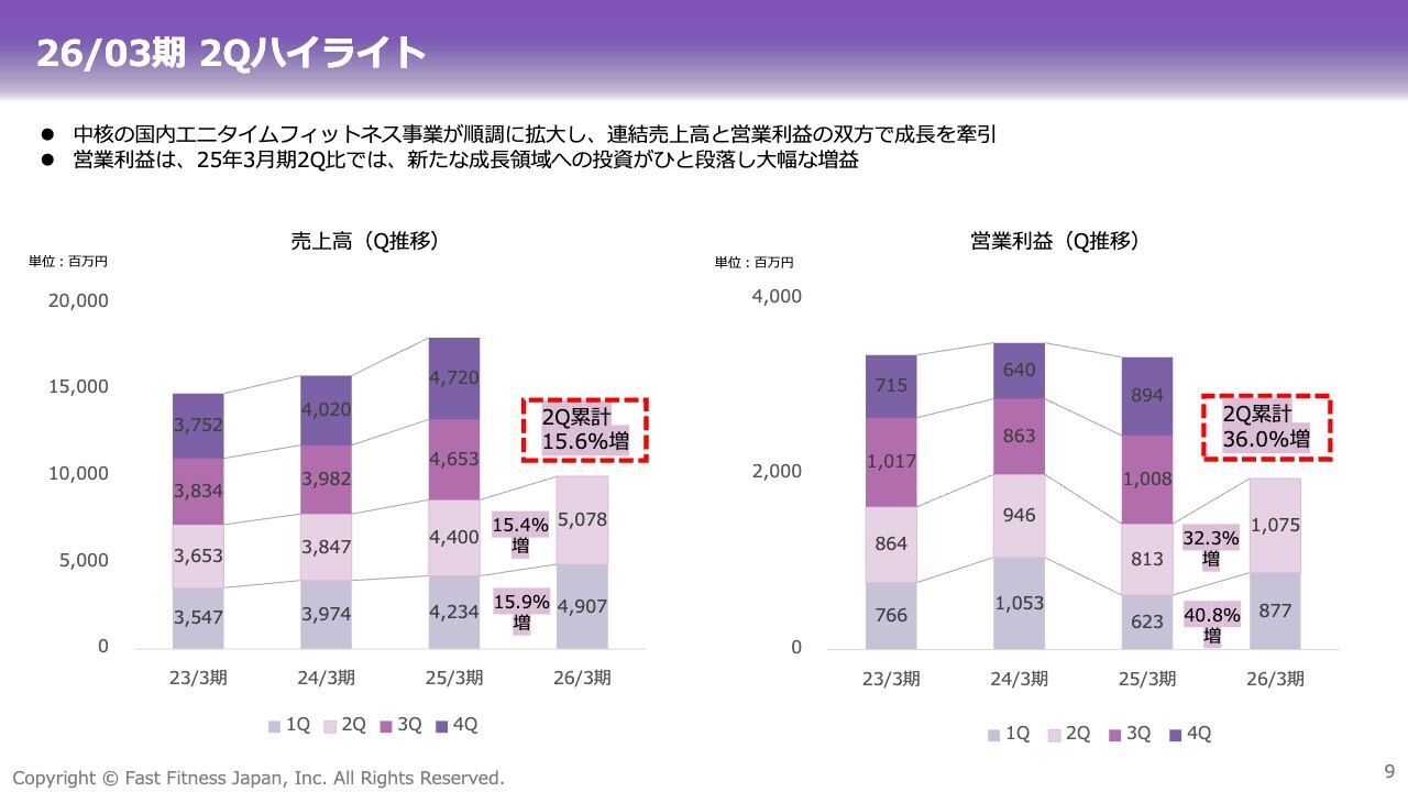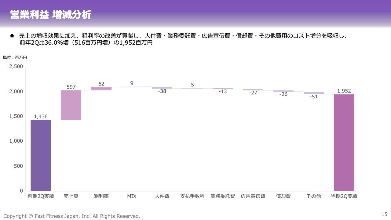 第2四半期累計の売上高は、前年同期比プラス15.6パーセントと、継続的な成長を達成しています。店舗数の増加と1店舗当たりの会員数の回復が、引き続き成長に寄与しています。