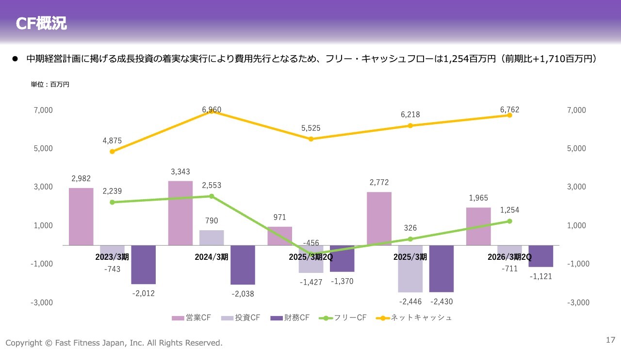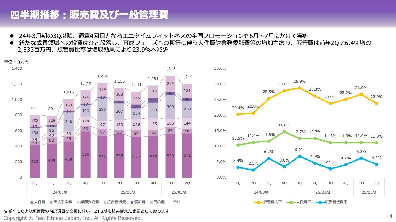 第2四半期累計の営業利益は、前年同期比プラス36.0パーセントと、売上高を上回るペースで伸びています。新たな成長領域への投資が一巡したことに加え、会員基盤の拡大や経営効率の改善により、費用構造の最適化が進んだ結果です。