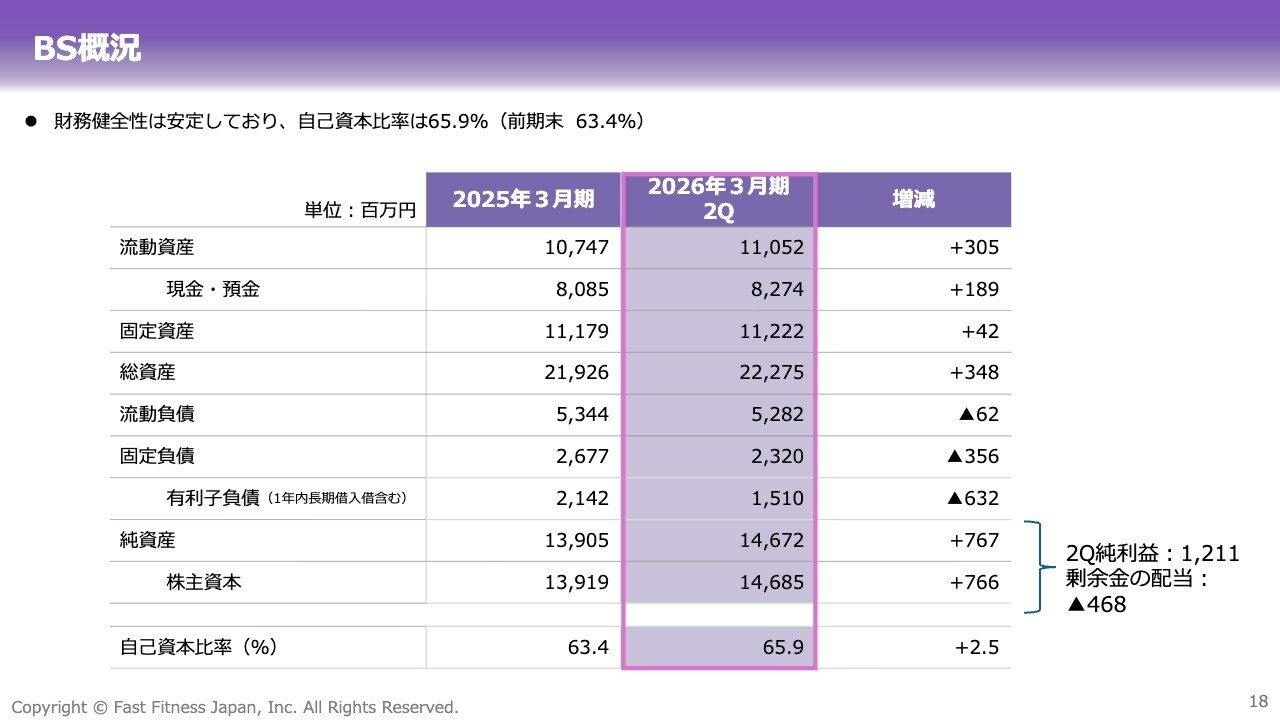 貸借対照表(BS)についてです。自己資本比率は65.9パーセントと、引き続き非常に高い財務健全性を保持しています。